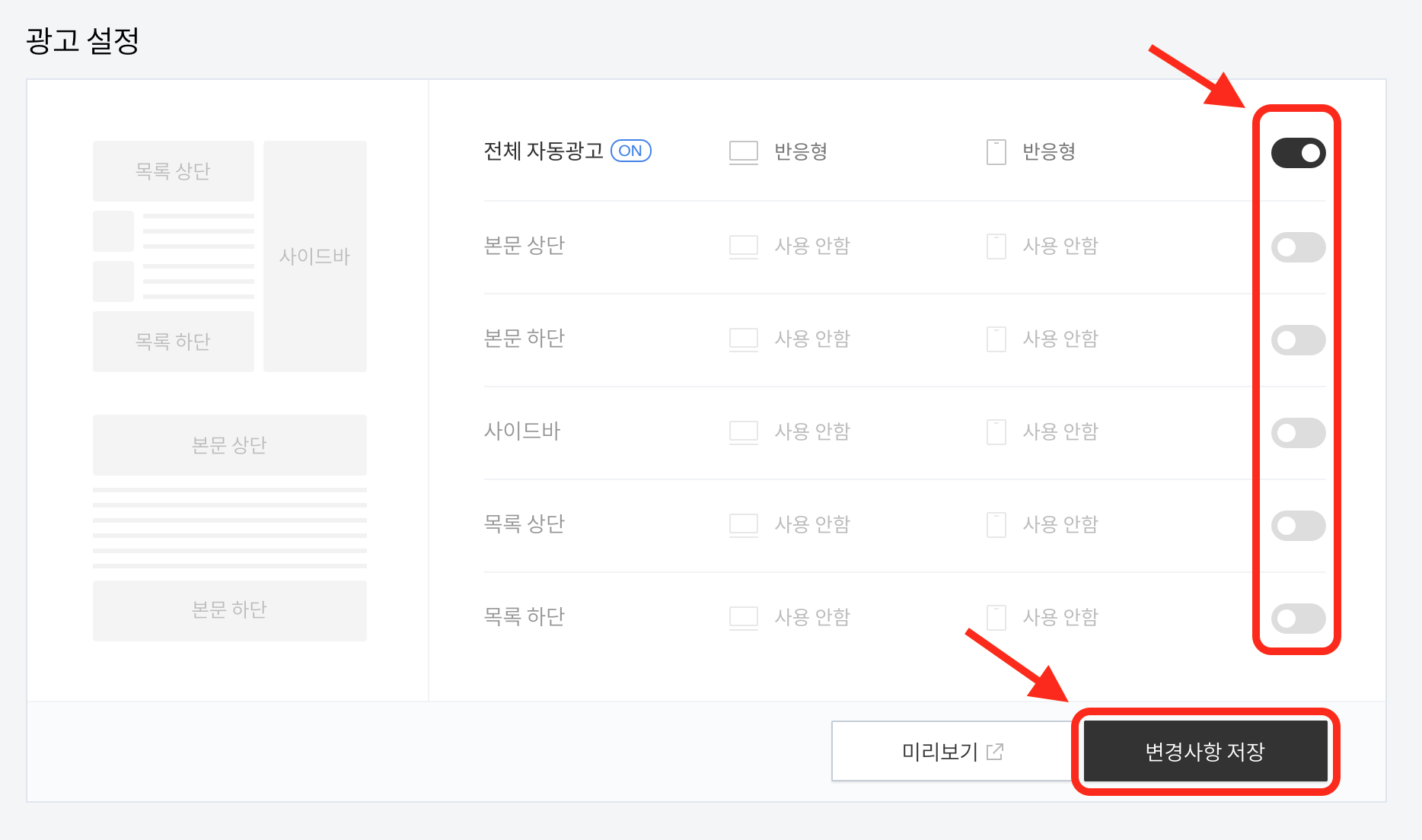 페이지를 내리시면 '광고 설정'이 보이실겁니다. 옆에 내가 원하는 광고의 위치를 활성화를 시킨뒤 '변경사항 저장'을 눌러주시면 드디어 블로그에 광고에 나오기 시작합니다.