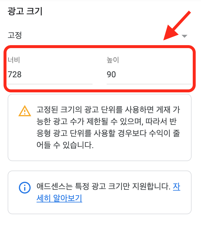 오른쪽 상단에 보시면 광고 크기라고 해서 반응형과 고정이 있는데, 고정을 클릭하시면 너비와 높이를 지정하실 수 있습니다. 그럼 내 블로그 안에서 광고 크기가 얼마큼 나오게 되는지 지정할 수 있는겁니다. 하지만 아래 보이시는 경고 문구 처럼 광고 수가 제한되거나 수익이 줄어들 수 있으니 조심하셔야 합니다. 처음하시는 분들은 어려울 수 있으니 반응형을 하시는 것을 추천드립니다