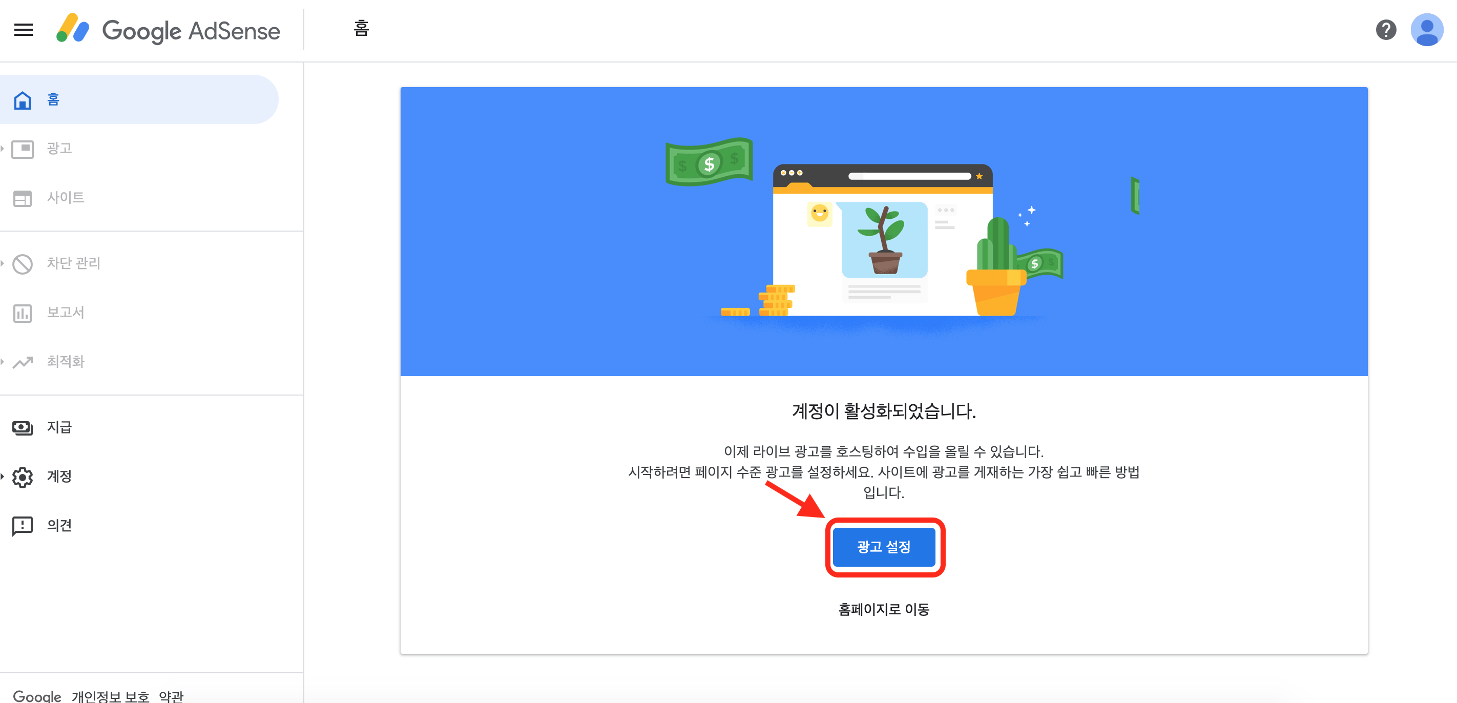 축하합니다. 메일입니다 ㅎㅎ 이제 광고를 넣을 수 있다는 의미입니다. '시작하기'를 눌러주세요