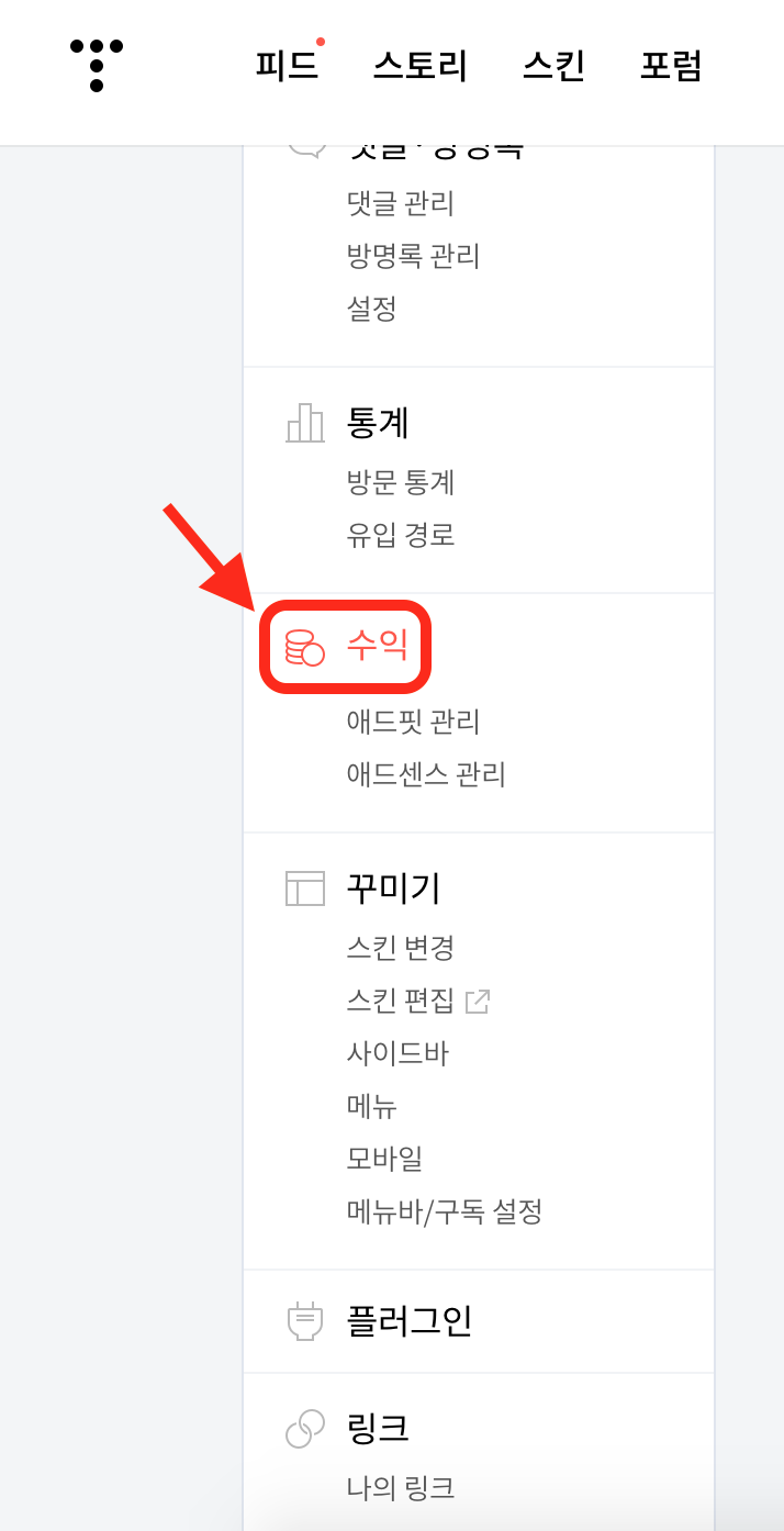 일단 다시 '관리'로 가시면 목록 중에 '수익'이라는 목록이 보이실겁니다. 클릭해줍니다.