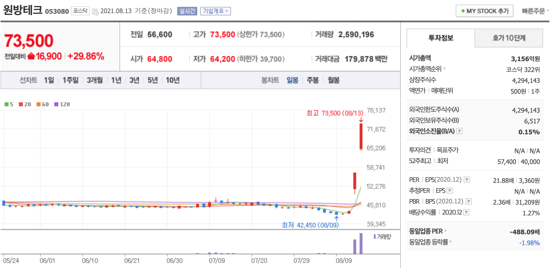 원방테크, 무상증자 소식에 이틀째 상한가, 52주 신고가 경신