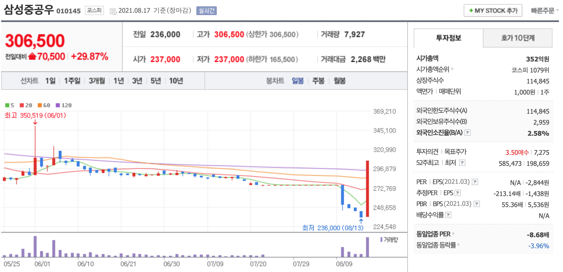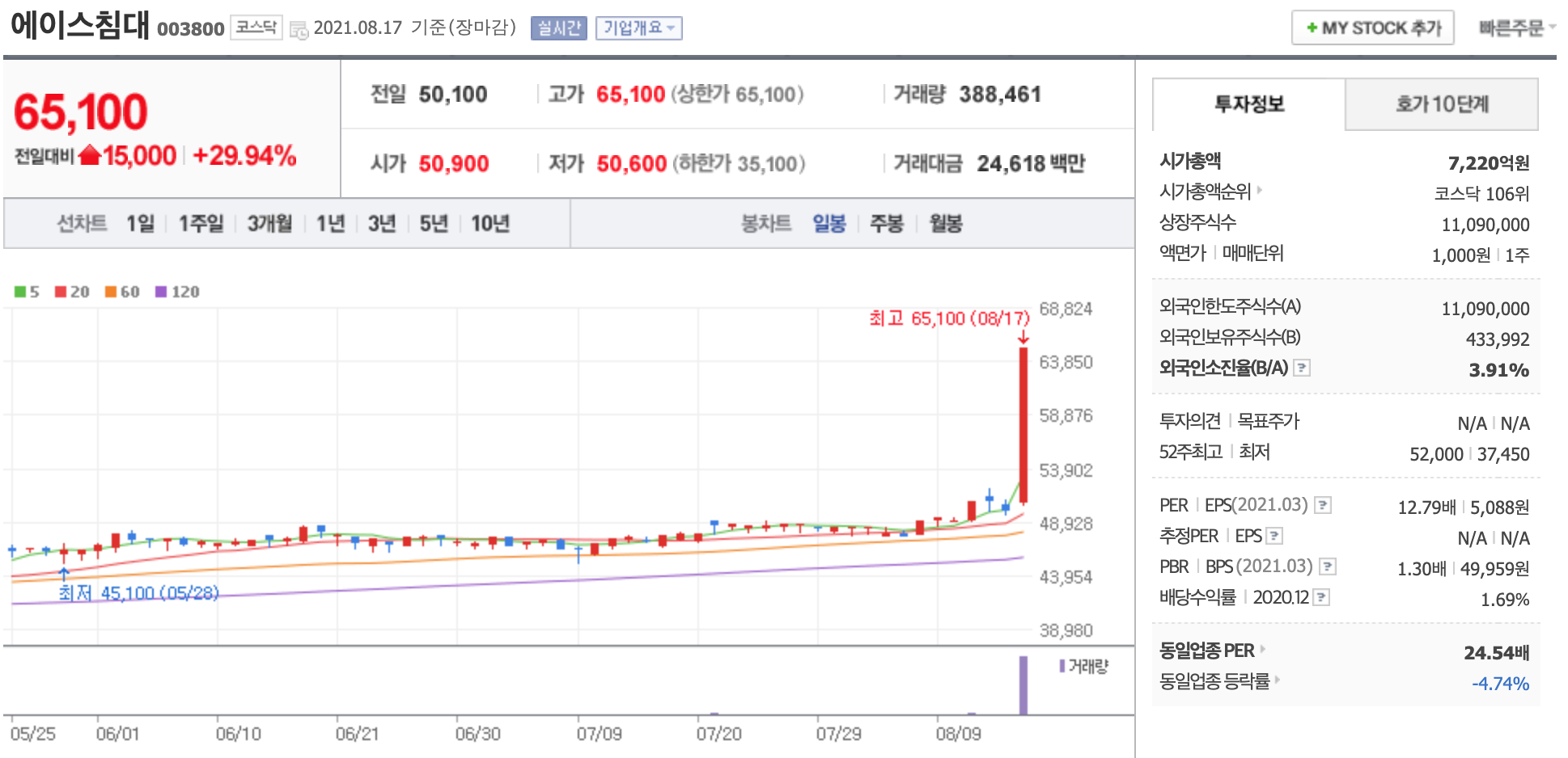 상한가 종목과 관련기사입니다. 🐜🐜출처 - 네이버 증권