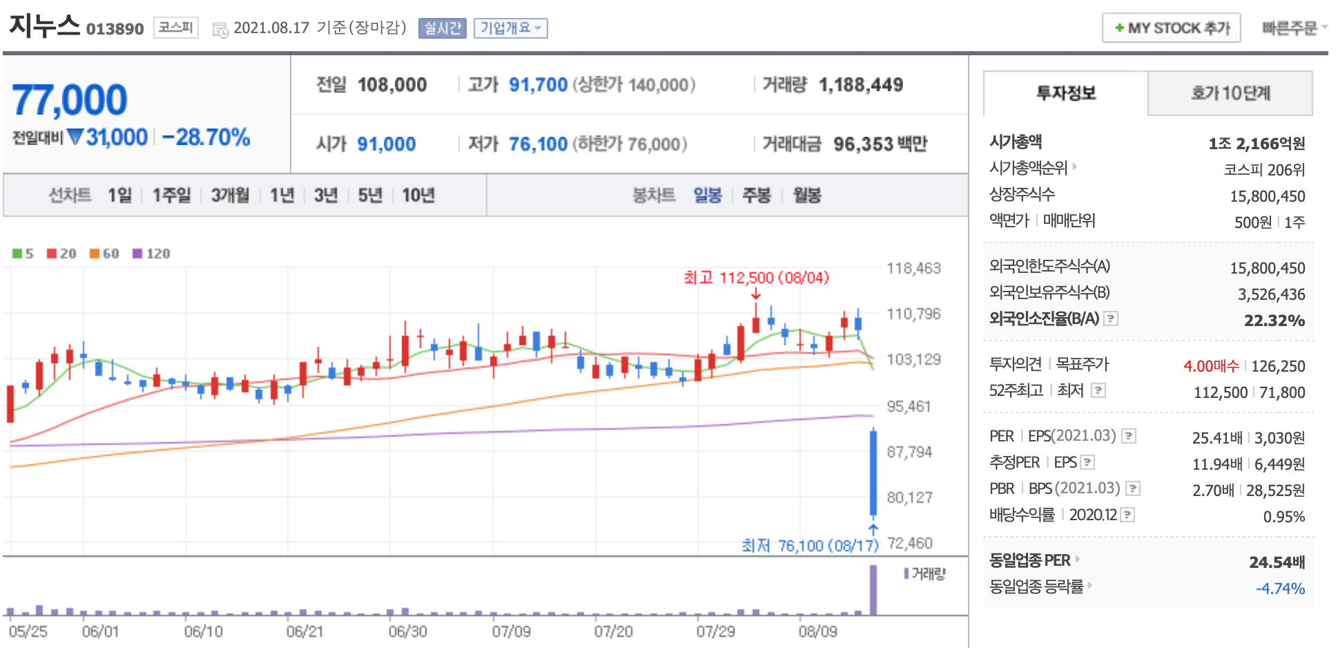 장 개시 직후 주가는 7만8000원까지 올랐으나 이내 하락세로 전환, 하락폭을 키운 끝에 하락제한폭까지 떨어지는 성적을 기록했다. 다만 주가가 공모가 밑으로 떨어지진 않아 공모가 대비 손실이 발생하는 건 막았다.