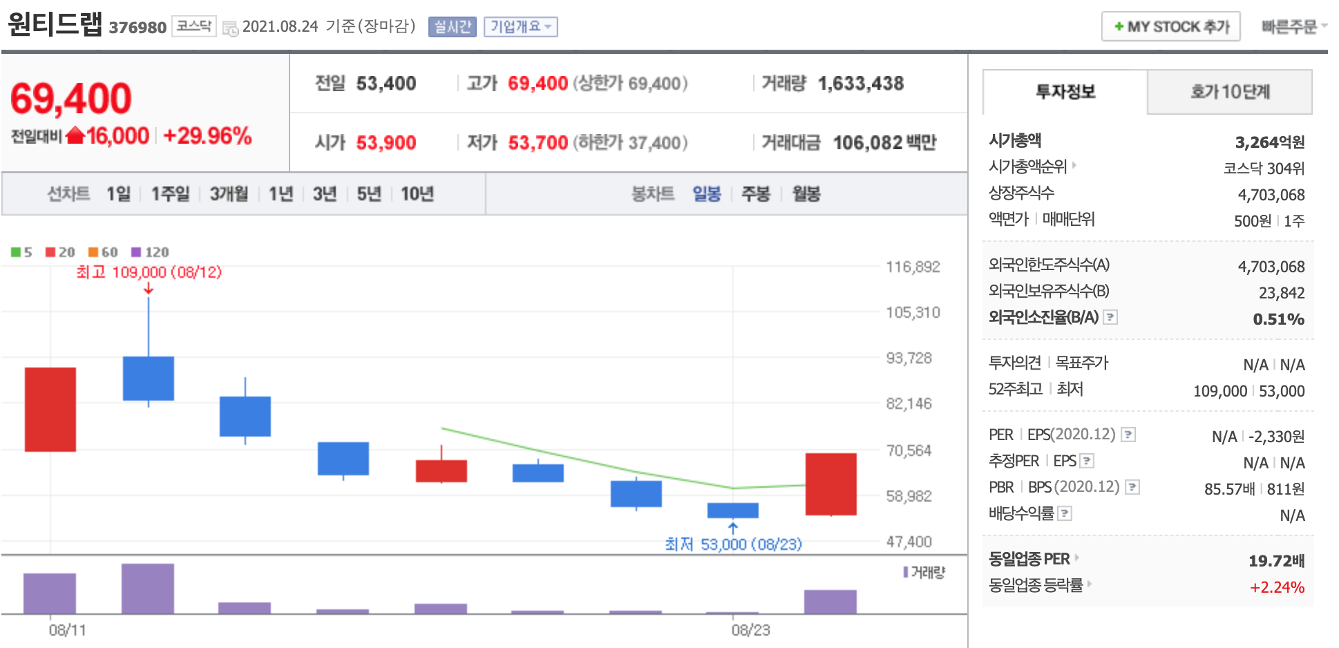 이날 상한가로 원티드랩은 상장 이후 장중 최저점(5만3000원) 대비 30.94% 올랐다. 아직 상장 후 이틀째 고점까지는 아직 갈 길이 남은 상태이지만 종가 기준으로는 앞으로 31% 더 오르면 상장 첫 날 고점을 회복하게 된다.