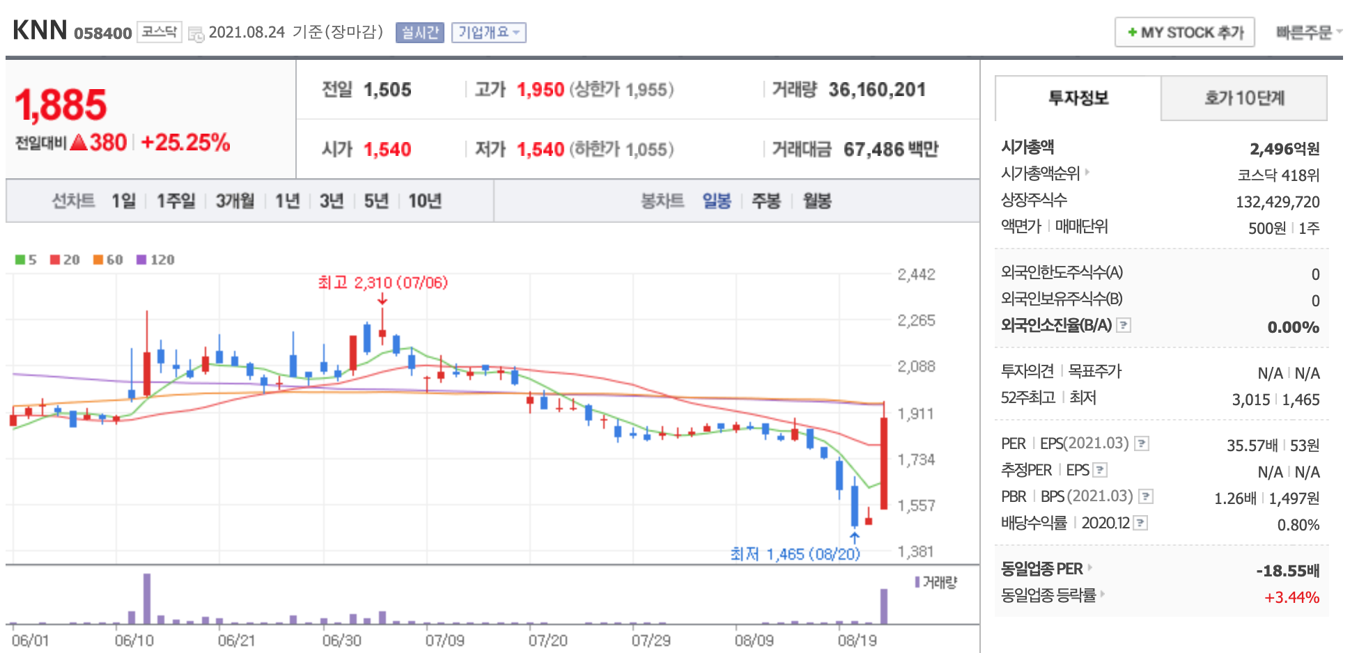 KNN 주가가 상승세다. KNN 시가총액은 2549억원이며, 시총순위는 코스닥 426위다. 액면가는 1주당 500원이다.
