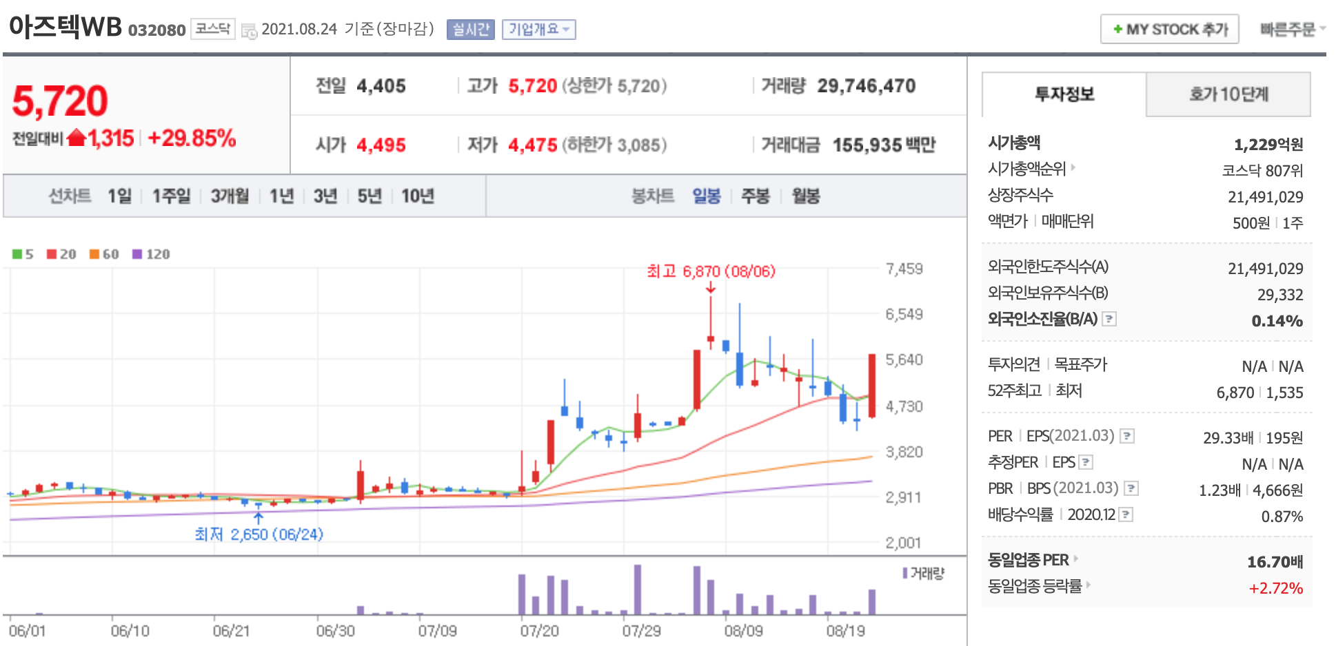 아즈텍WB가 상한가를 달성했다. 앞서 지난 23일 큐라티스는 라이트펀드의 연구비 지원 사업 선정 과제 '주혈흡충증 백신 (QTP105)`의 공동 연구자로서 선정됐다고 밝혔다.