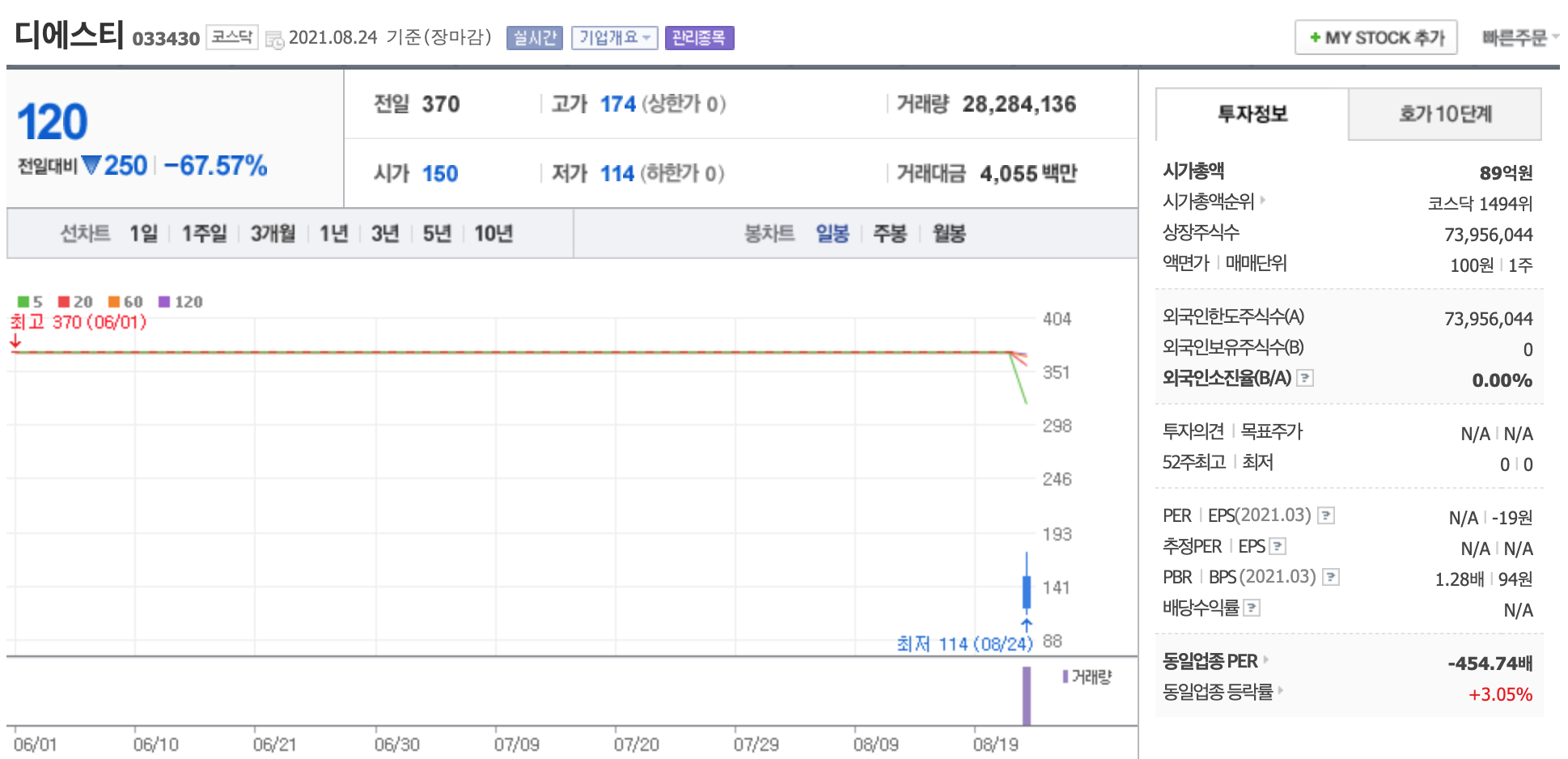 디에스티가 상장폐지를 위한 정리매매 첫 날 주가가 급락하고 있다. 정리매매 기간 중에는 주가가 가격제한폭 없이 움직일 수 있다.
