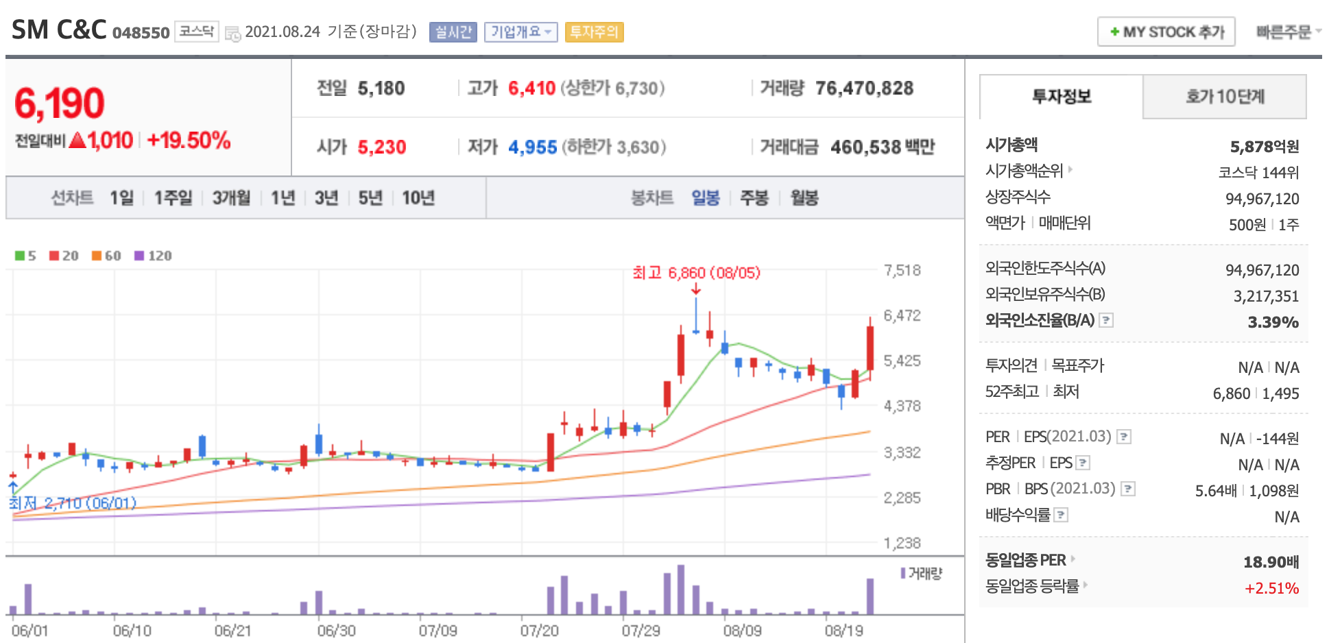 SM C&C 시가총액은 5537억원이며, 시총순위는 코스닥 156위다. 액면가는 1주당 500원이다.