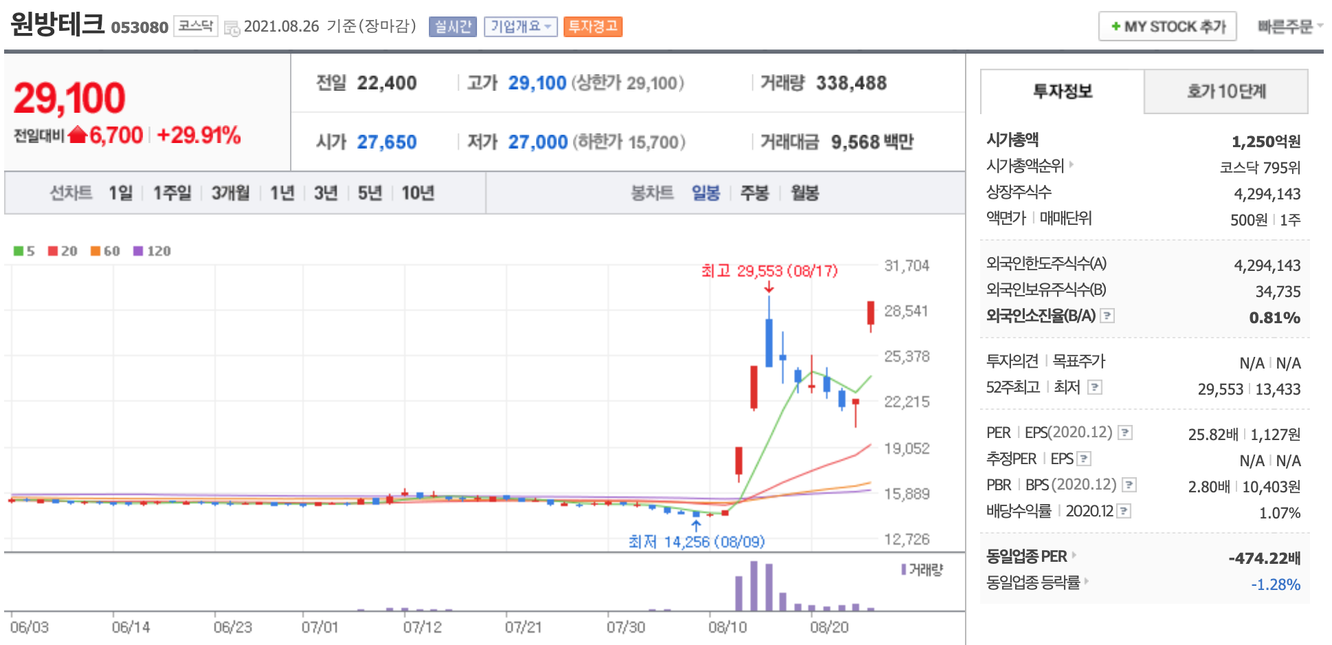원방테크 주가는 무상증자 결정이 공시된 다음날인 지난 12일부터 13일까지 이틀간 가격제한폭까지 오른 후 마감한 바 있다.