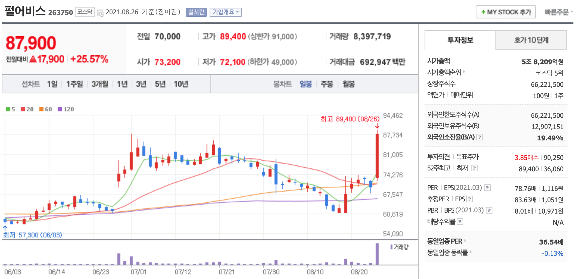 중소형 게임사 펄어비스 주가는 전날보다 1만7900원(25.57%)이나 급등한 8만7900원에 거래를 마쳤다. 이날 종가는 회사가 액면분할을 실시한 지난 4월 16일 이후 최고 수준이다.