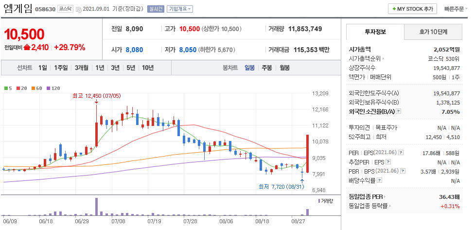 엠게임 - 소프트웨어개발, 게임소프트웨어 등을영위할 목적으로 1999년 12월 28일에 설립되었으며, 2008년 코스닥시장에 상장됨.