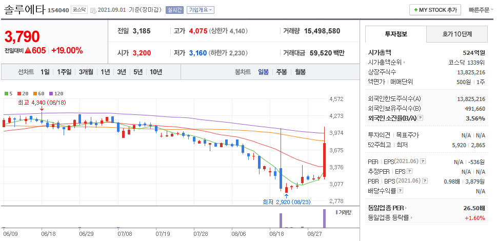 솔루에타 시가총액은 532억원이며, 시총순위는 코스닥 1353위다. 액면가는 1주당 500원이다.