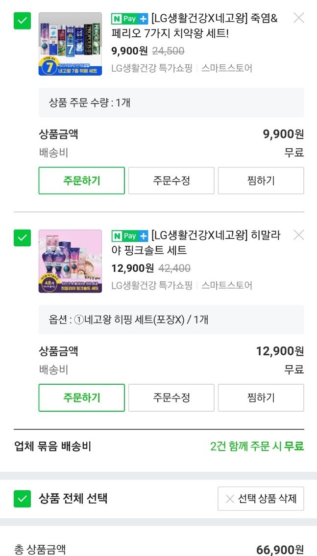 저는 이렇게 히말라야 핑크솔트 세트와 7가지 치약왕 세트를 주문했습니다.
