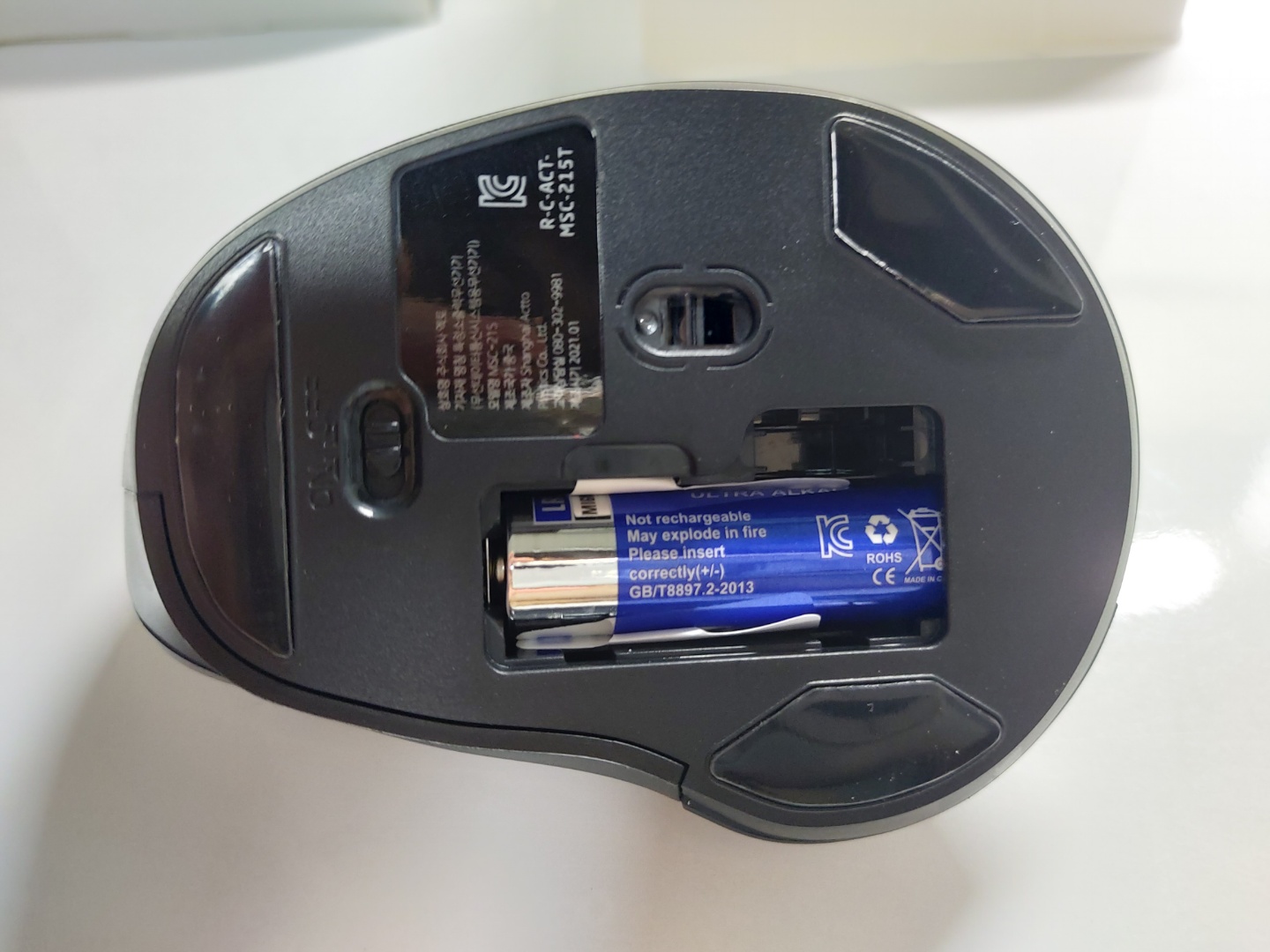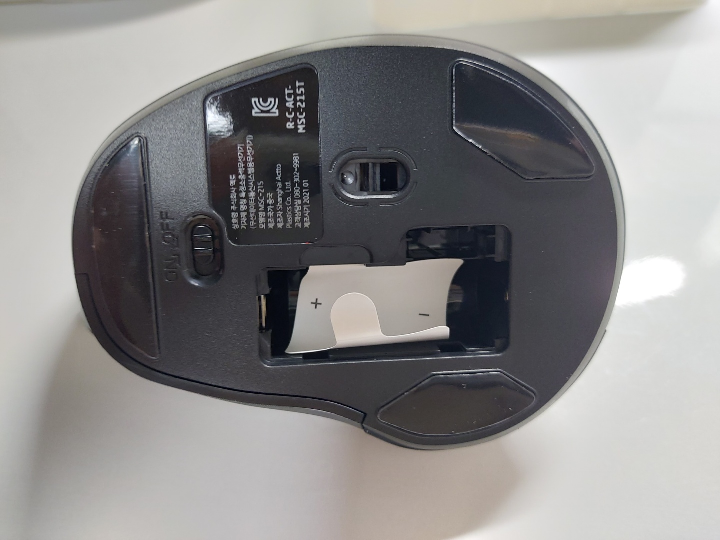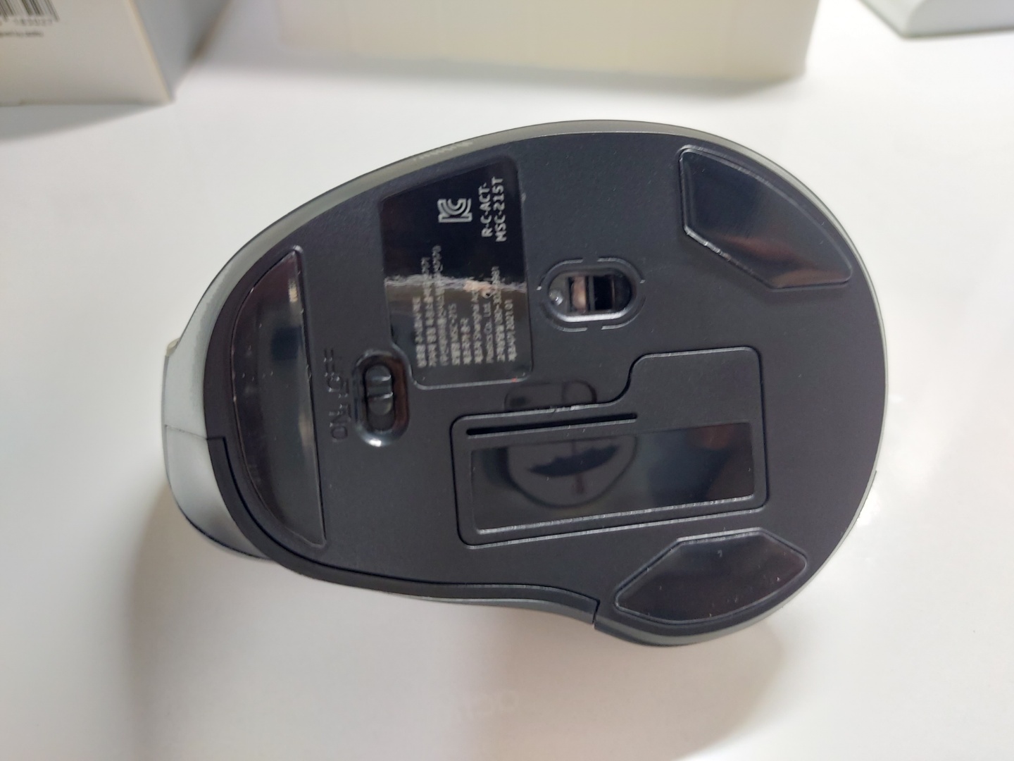 마우스 아래 면입니다. 건전지를 넣을 수 있는 곳과 전원 ON/OFF 설정을 할 수 있는 버튼이 있습니다.