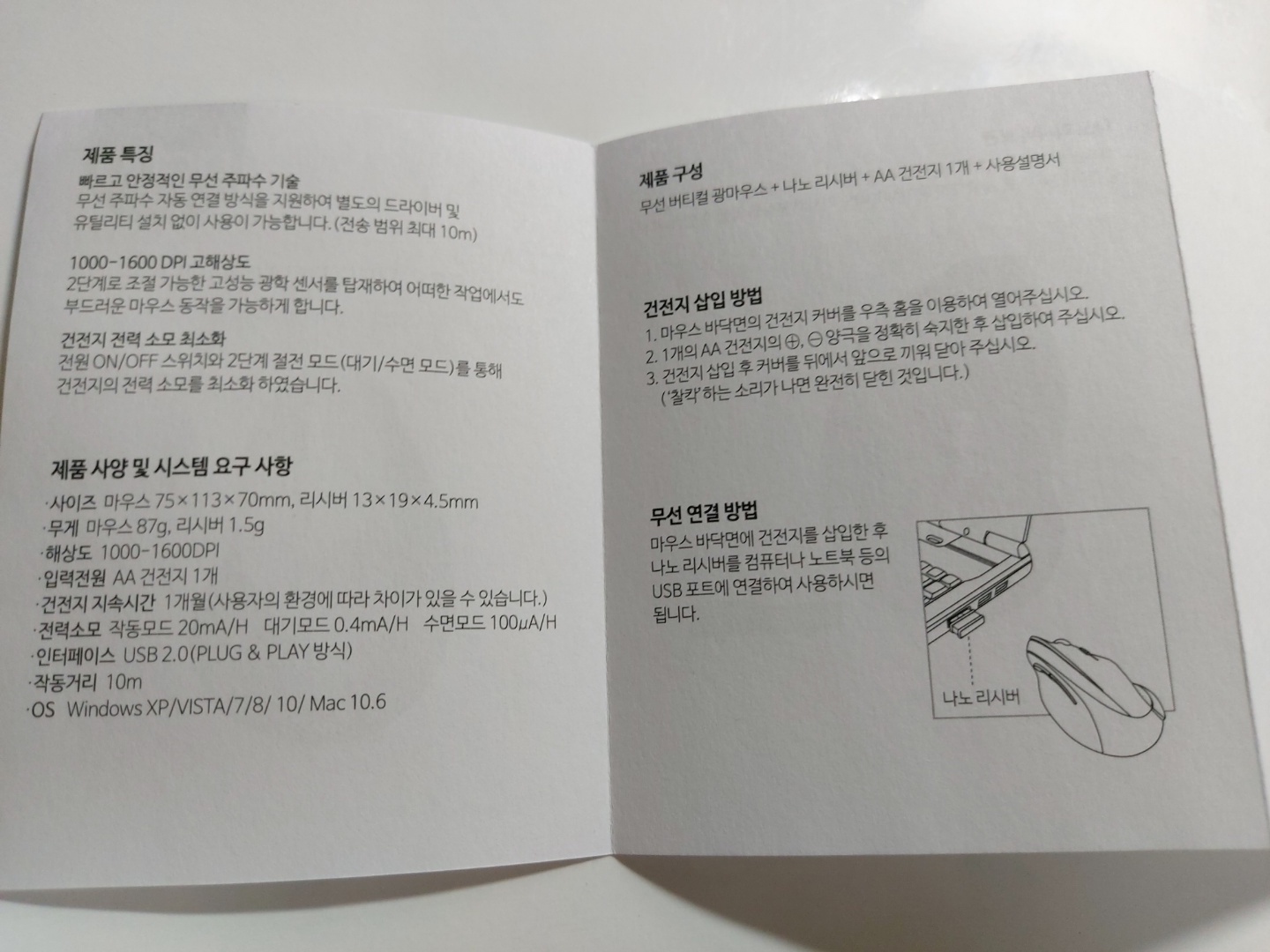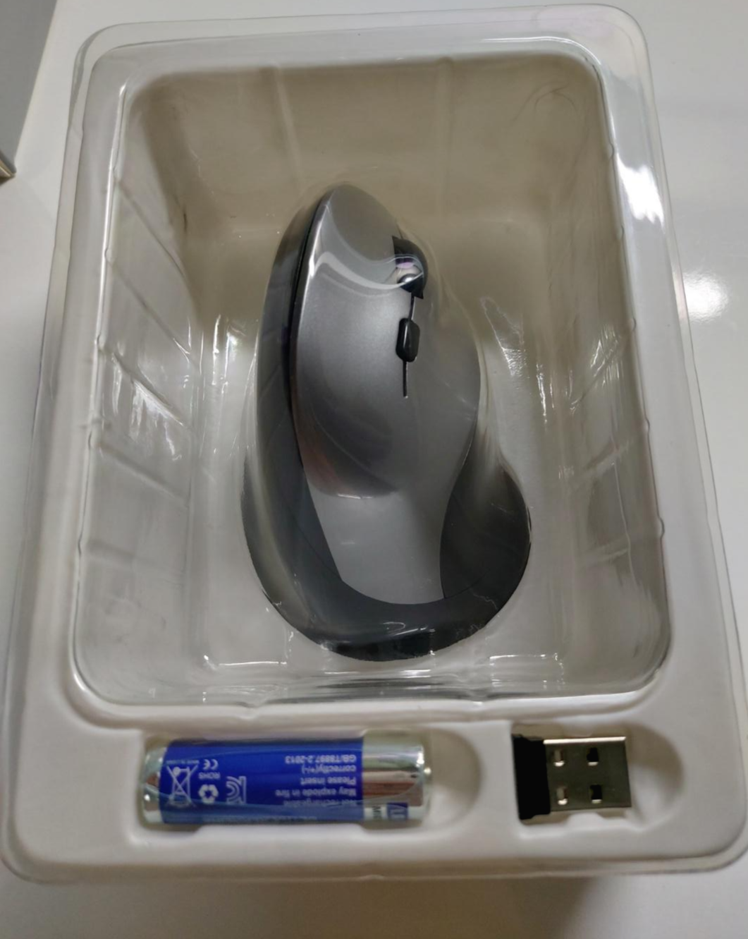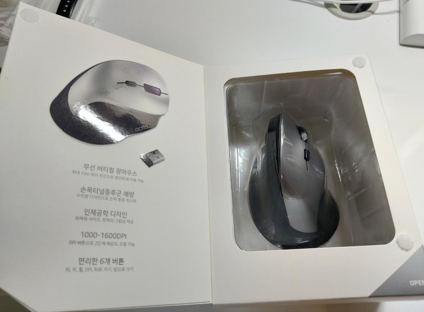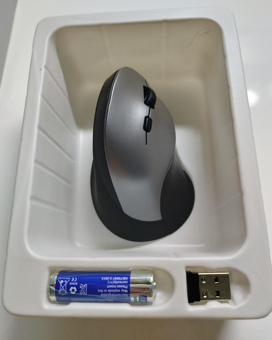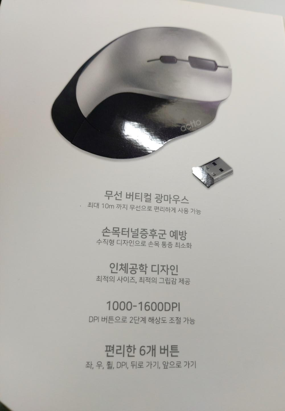 내용물은 무선 버티컬 광 마우스 본체, USB 연결 잭(나노 리시버), AA 건전지가 들어있습니다.