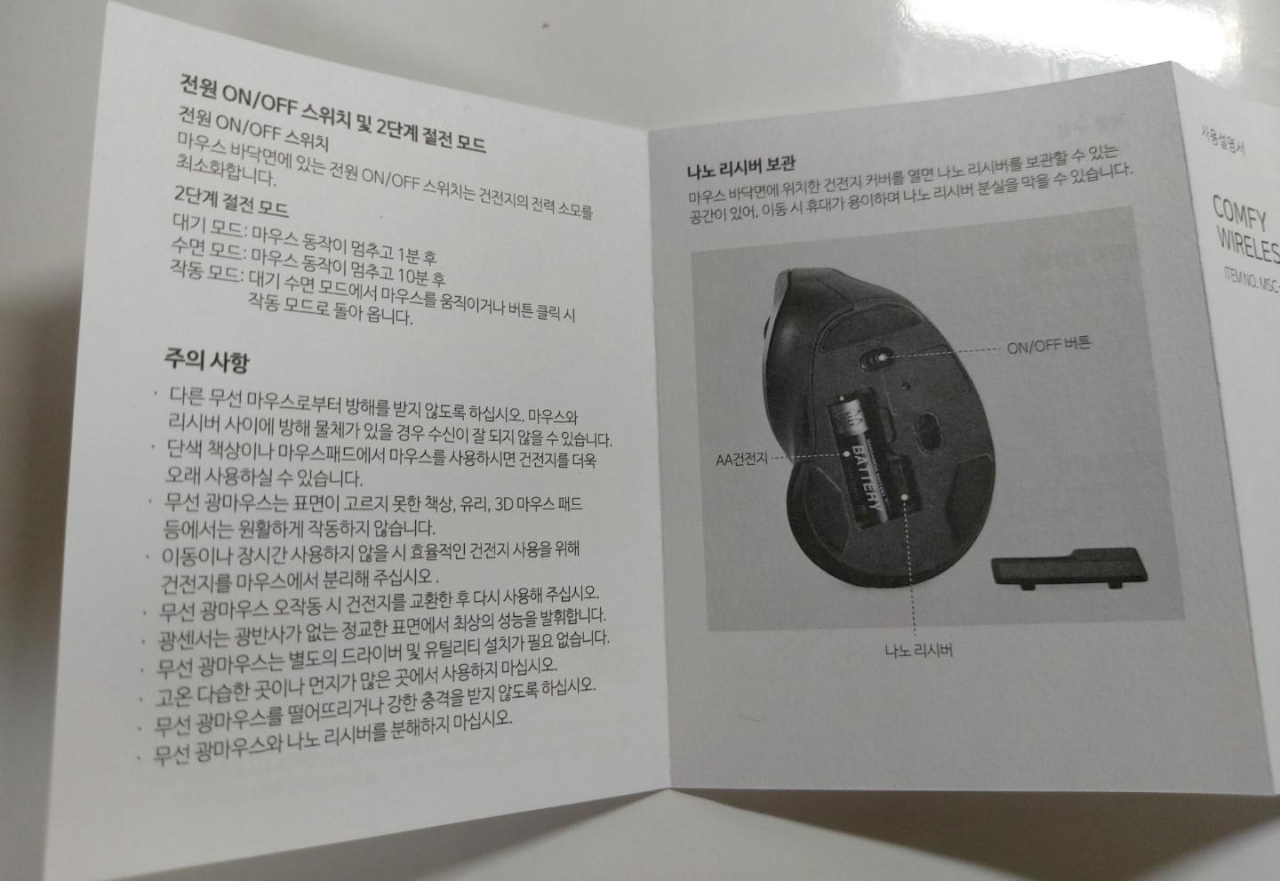 설명서 뒷면에는 전원 ON/OFF 스위치 설명과 절전 모드 설명이 되었습니다.