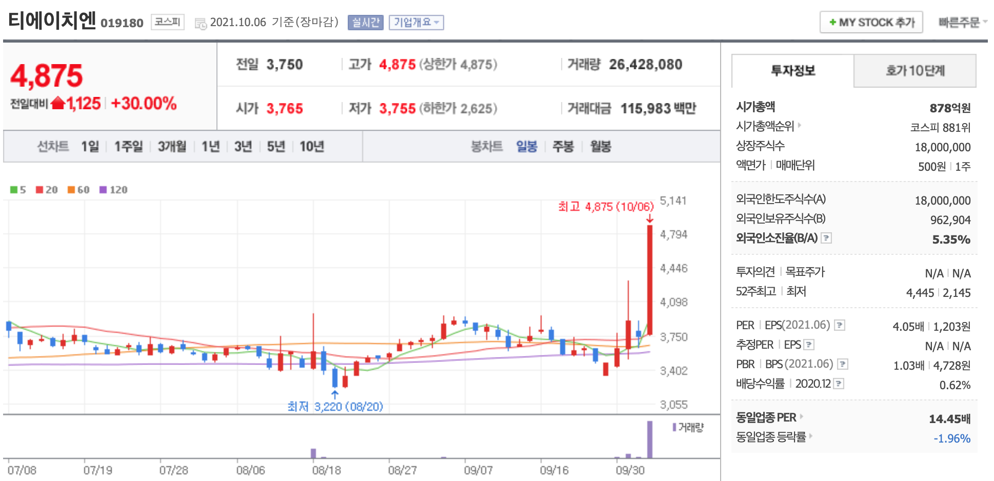 티에이치엔이 현대차 넥쏘에 부품을 공급하고 있다는 사실이 알려지며 10월 6일 주가가 급등했다.