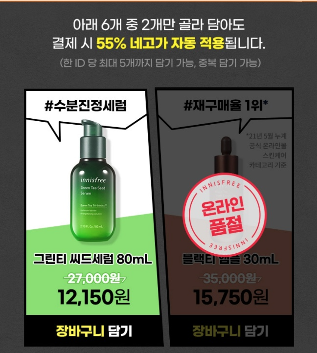 수분 진정 세럼 -> 그린티 씨드세럼 80ml (27,000원 -> 12,150원)