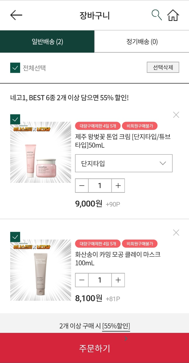 2개만 담아도 즉시 55% 할인!! 반값을 넘는 할인율을 보여줍니다.