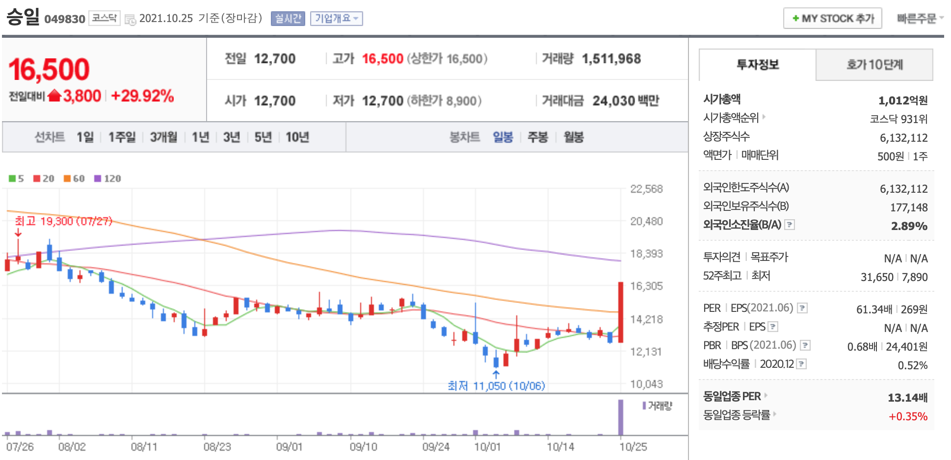 승일 주가가 상승세다. 승일 시가총액은 877억원이며, 시총순위는 코스닥 1036위다. 액면가는 1주당 500원이다.