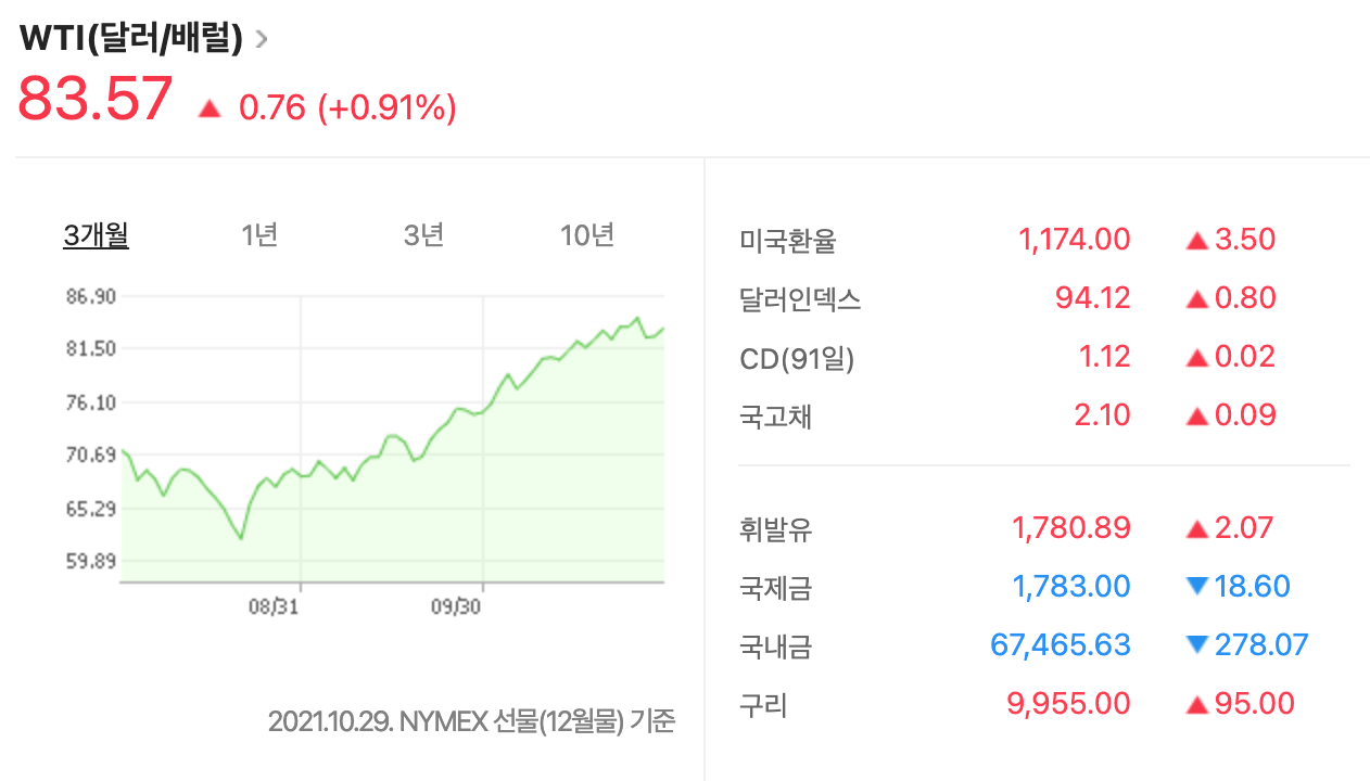 29일(현지시각) 뉴욕상업거래소에서 12월물 서부텍사스산원유(WTI) 가격은 전 거래일 대비 0.76달러(0.9%) 상승한 배럴당 83.57달러에 거래를 마쳤다.