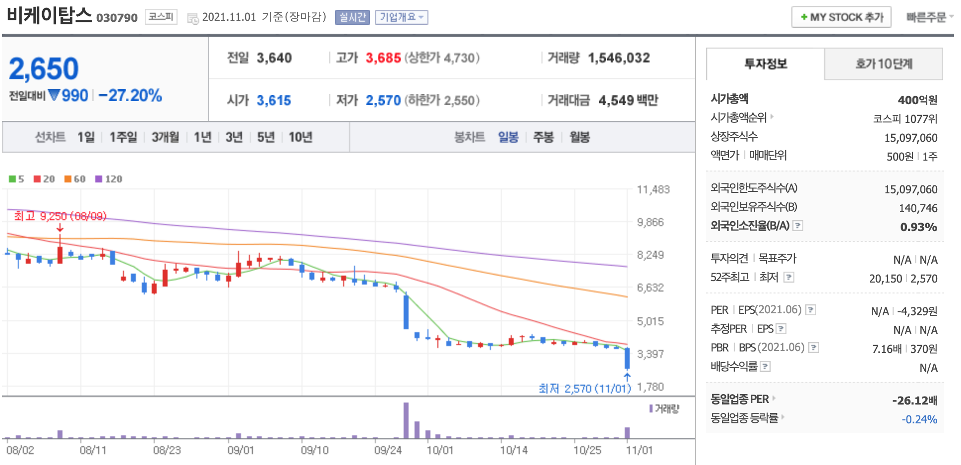 비케이탑스 주가가 큰 폭으로 하락하고 있다.