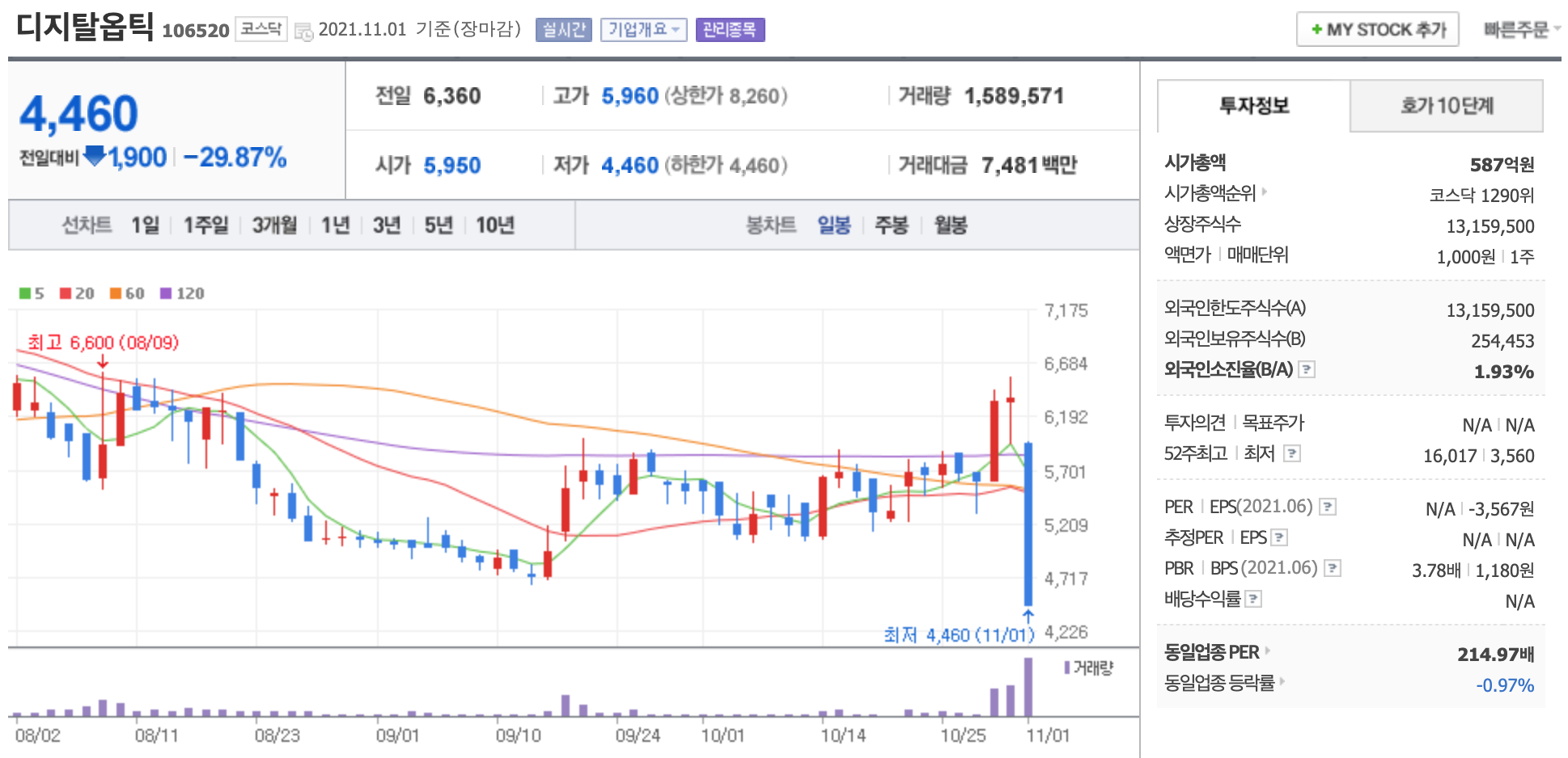 디지탈옵틱, 유상증자 앞두고 하한가 (관리종목)