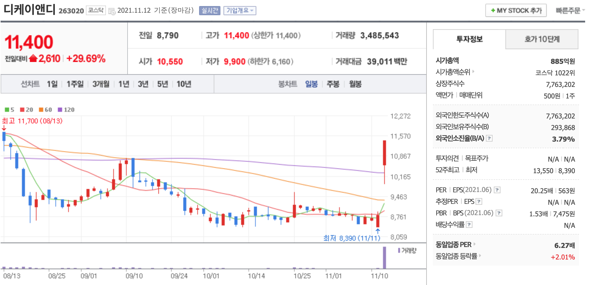 디케이앤디, 무상증자 결정 소식에 29% 상승, 보통주 1주당 신주 1주 배정, 다음 달 20일 상장