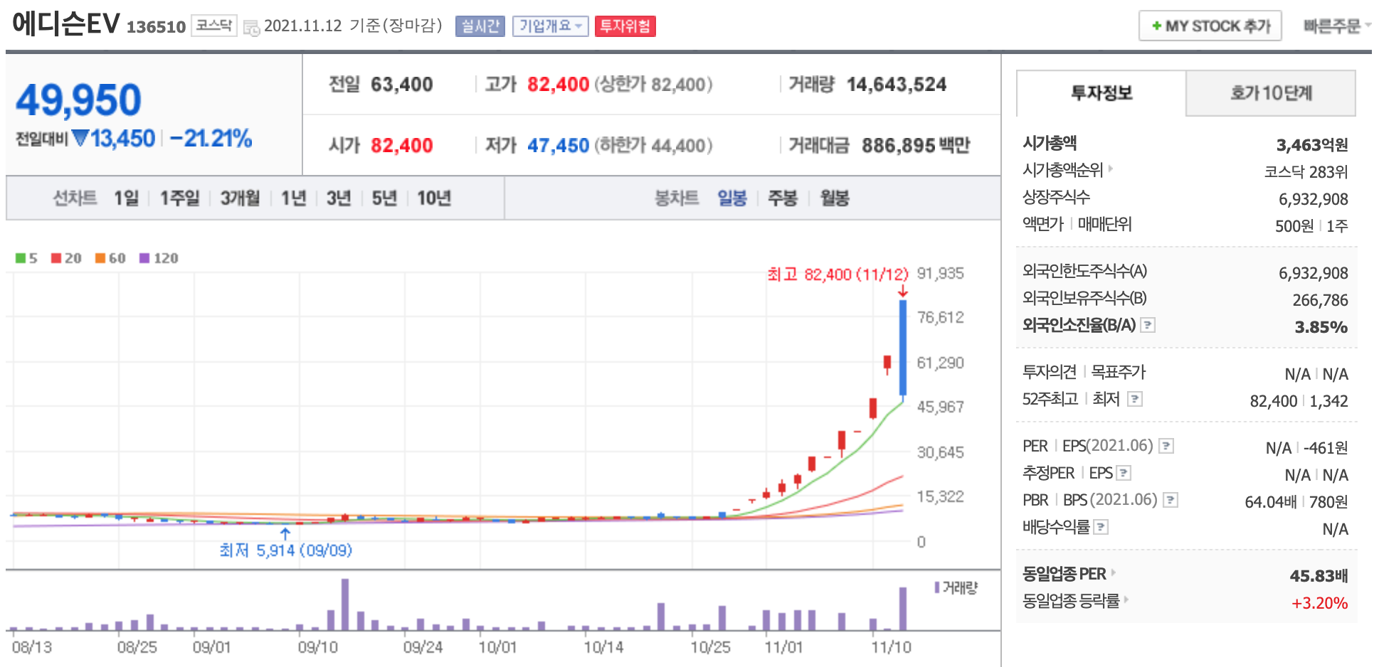 2~3만원 대의 주가를 오갔던 에디슨EV는 지난달 20일 쌍용차 인수협상 대상자에 선정되고 1주당 3주를 배정하는 무상증자를 발표하며 주가가 폭등하기 시작했다.
