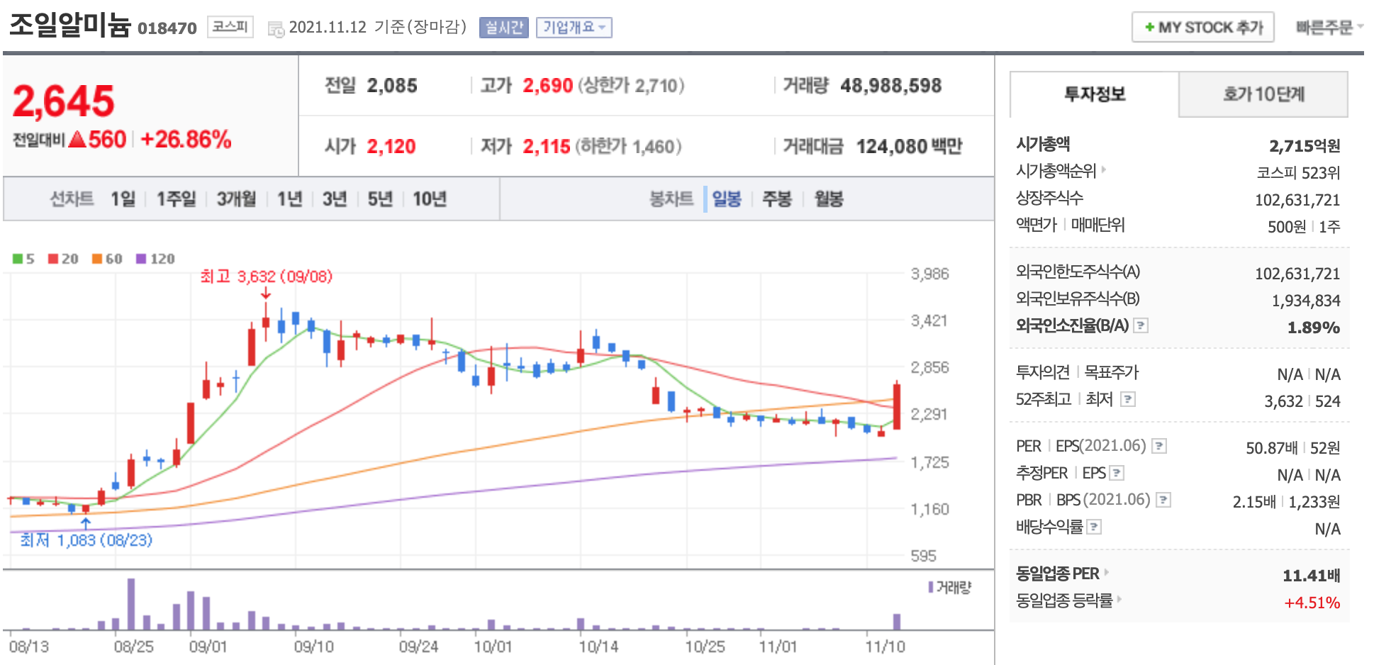 알루미늄 압연 전문 업체 조일알미늄 주가가 급등세를 보이는 중이다.