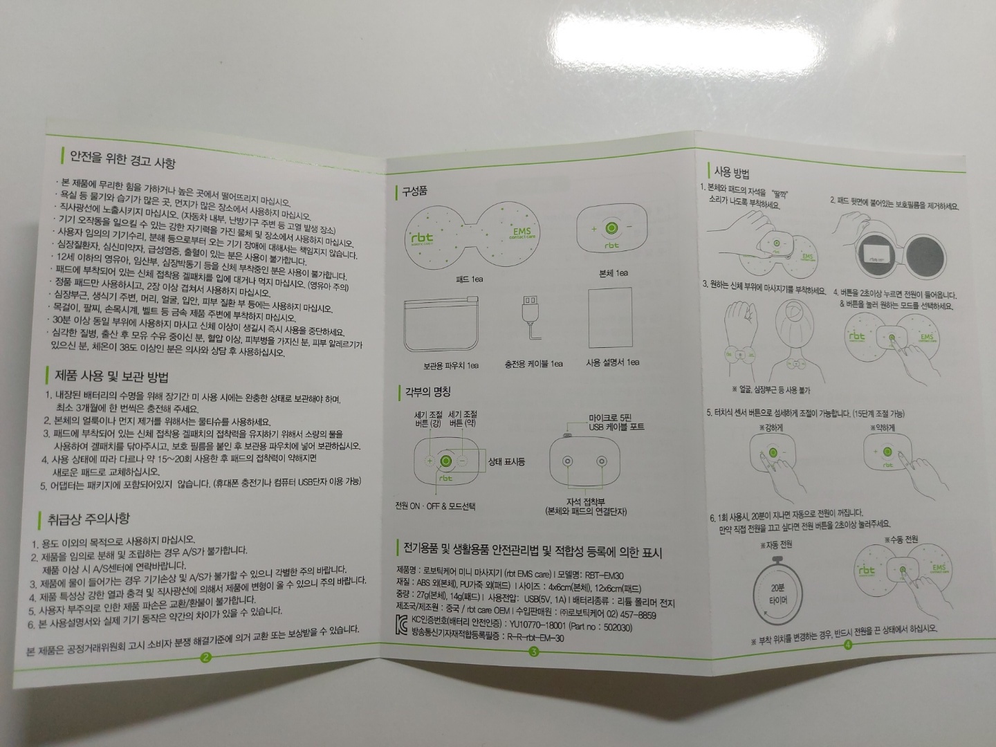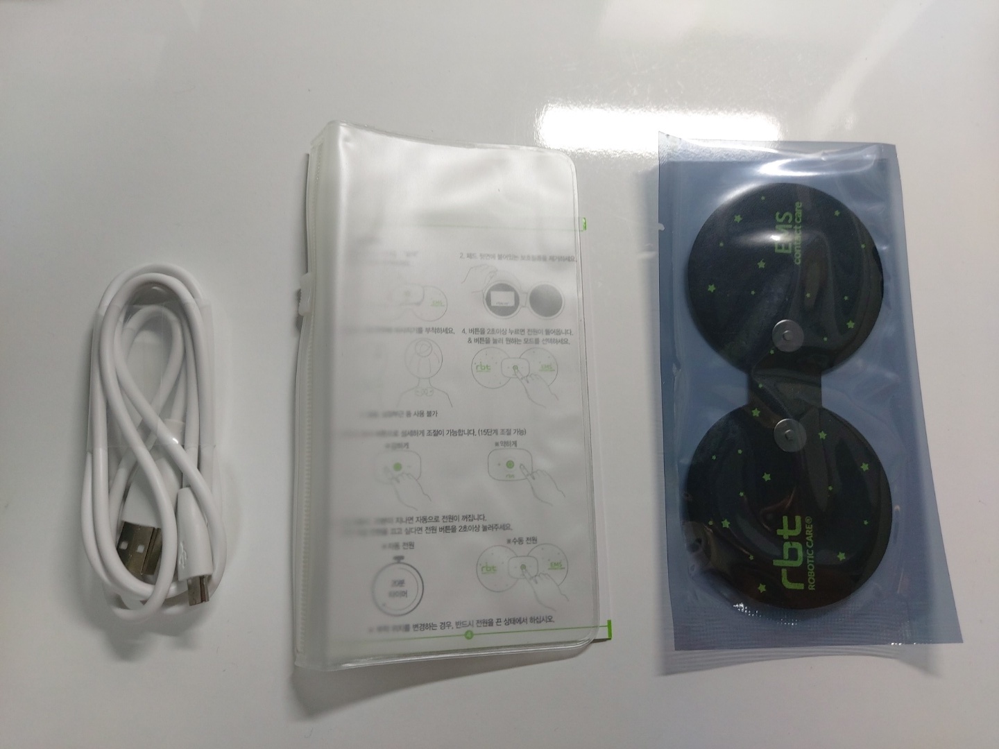 박스 안에는 마사지를 할 수 있는 패드와, 보관용 파우치(방수팩), 충전기 연결 탭이 들어있었습니다.