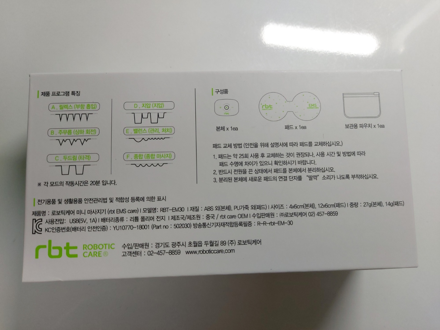 박스 뒷면을 보니 구성품과 제품 프로그램 설명, 패드 교체 방법 등 굳이 설명서를 보지 않아도 잘 설명이 되어있습니다.