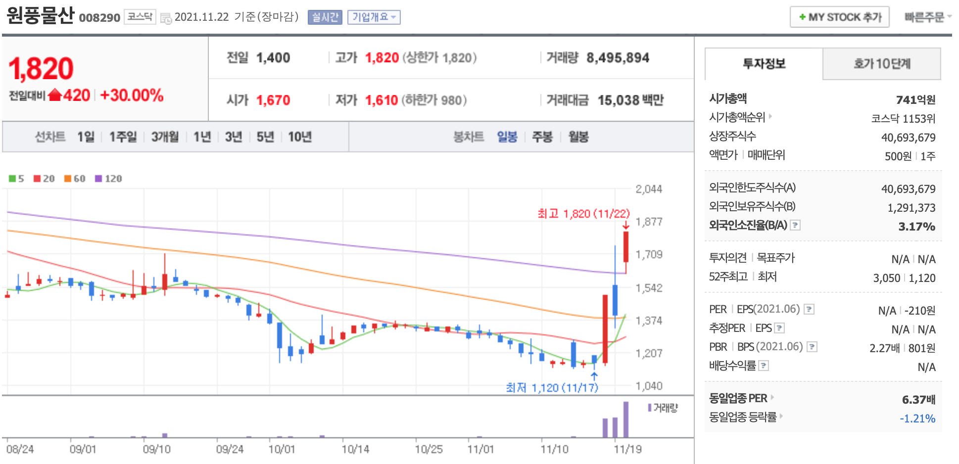 상한가 종목과 관련기사입니다. 🐜🐜출처 - 네이버 증권