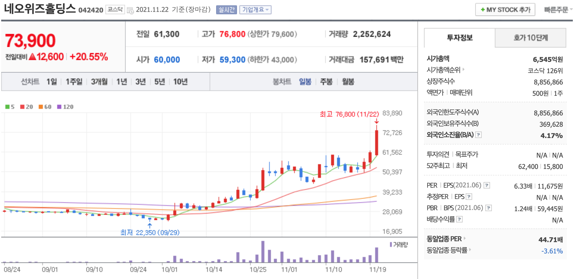 모회사 네오위즈홀딩스가 100% 보유한 네오플라이는 블록체인 전문 자회사로서 블록체인 노드 운영을 전담하고 있고 최근 가상자산사업자 신고를 완료했다. 이에 네오위즈에 대해 내년 신작 모멘텀과 NFT(대체불가능 토큰) 게임 개발에 기대가 된다고 말했다.