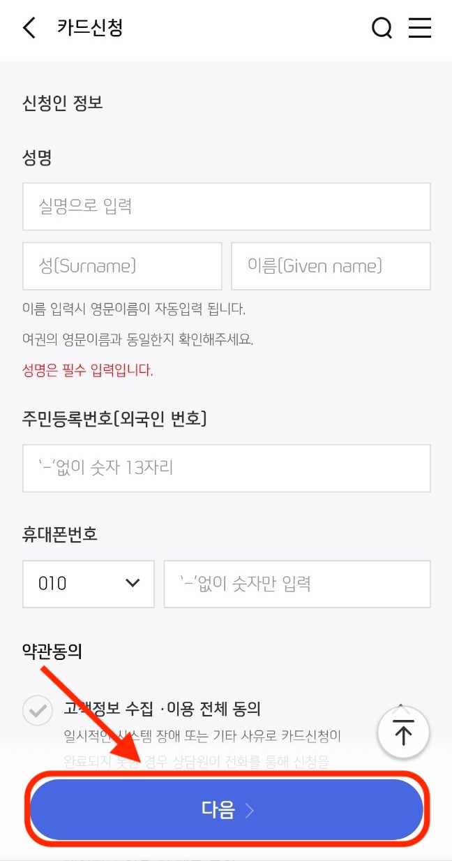 해당되는 성명, 주민등록번호, 휴대폰 번호, 약관의 동의를 체크하신 뒤 '다음'을 눌러줍니다.