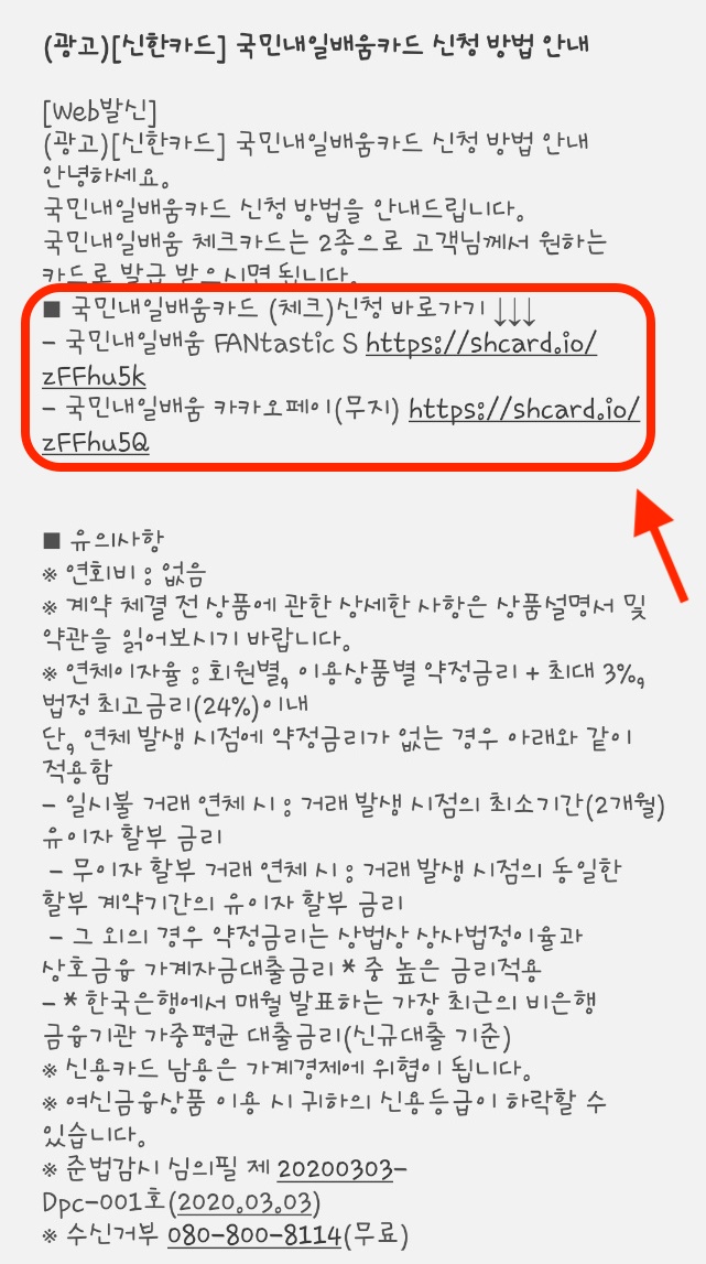 이렇게 신한은행 번호로 문자가 오게 됩니다. 저기 국민 내일 배움 카드 신청 바로가기를 눌러주시면 됩니다. 2가지 종류가 있는데요, 각각 혜택 받는 종류가 다릅니다.