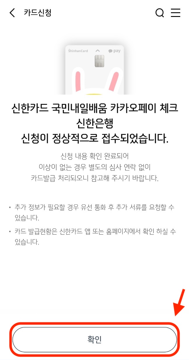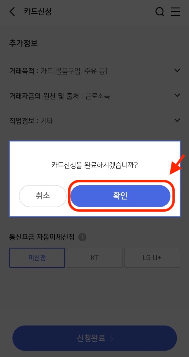 카드 신청을 완료하시겠습니까? 무조건 '확인'!! 을 눌러줍니다.