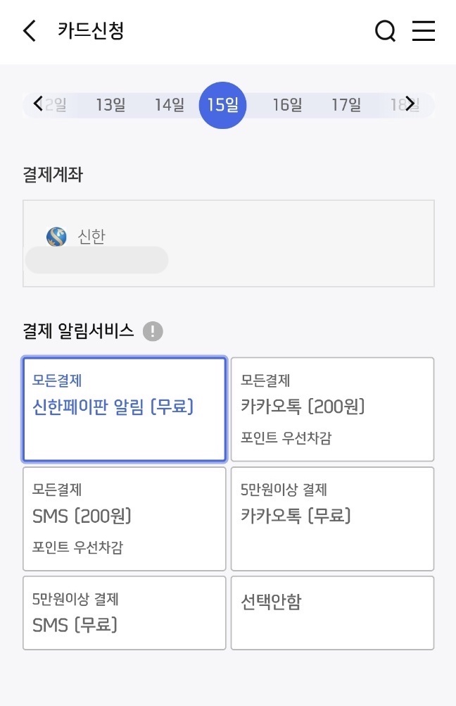 이제 중요한 카드 결제일을 선택합니다. 체크 카드 같은 경우 해당사항이 없는 것 같지만 저 같은 경우 후불 교통카드를 신청했기 때문에 필요한 부분입니다.