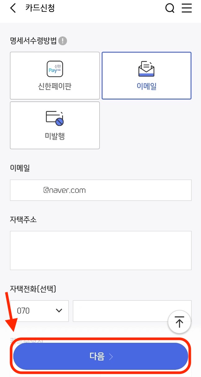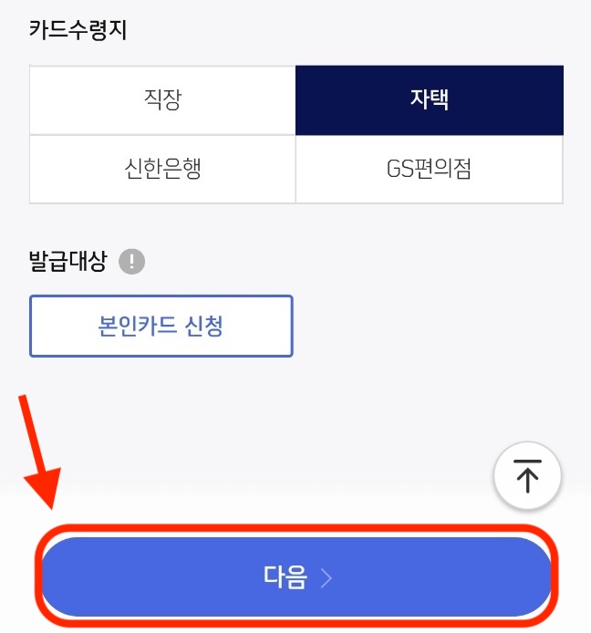그다음 카드 수령지를 선택해 줍니다. '다음'을 또 눌러주세요.