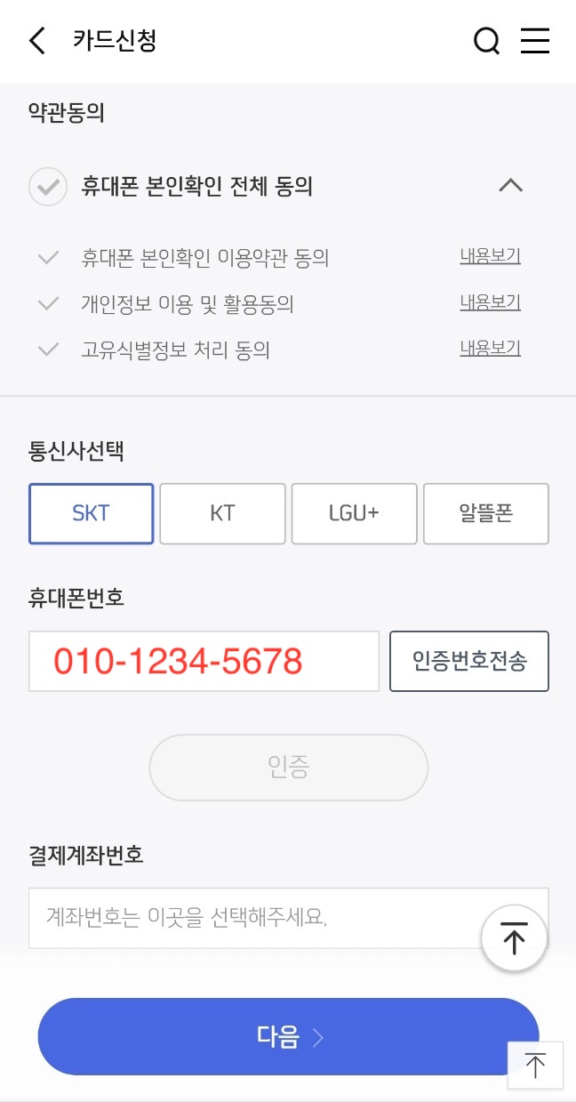 필요한 동의를 눌러주시고 통신사 선택 후 번호를 입력해주세요. 인증번호를 인증하시고 아래 결제계좌번호를 입력해주시면 됩니다.