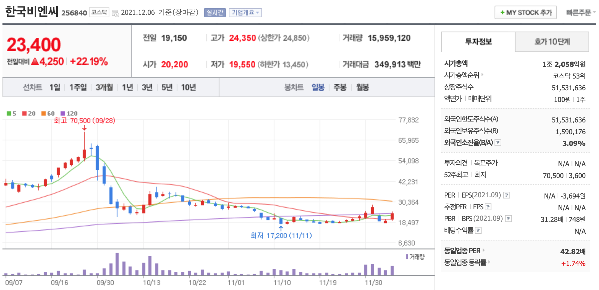 한국비엔씨가 신종 코로나바이러스 감염증(코로나19) 치료제 후보물질 ‘안트로퀴노놀’의 임상 2상 투약이 연내 마무리될 예정이라는 소식에 강세다. 한국비엔씨는 치료제 개발사인 대만의 골든바이오텍 협력사다.