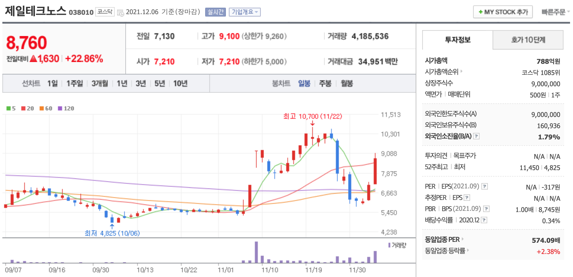 제일테크노스는 박정식 사외이사가 윤석열 국민의힘 대선 후보와 서울대학교 동문으로 알려지면서 관련주로 꼽혔었다.