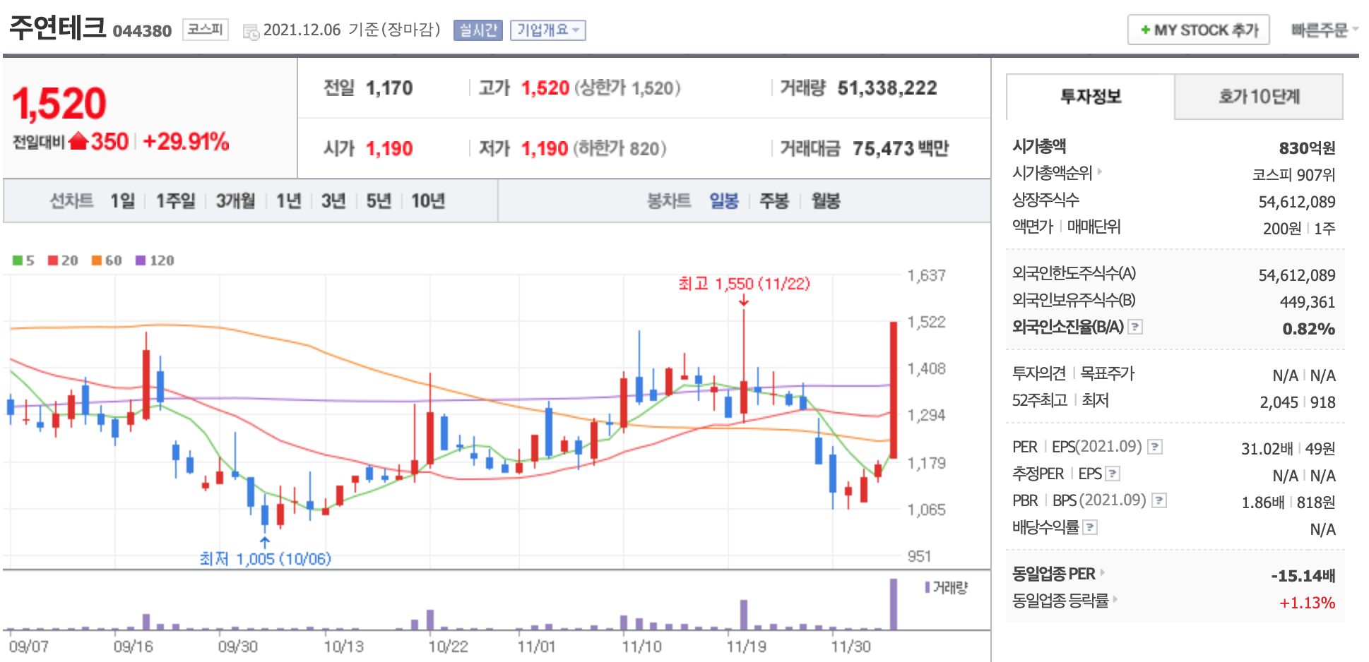 주연테크 시가총액은 792억원이며, 시총순위는 코스피 941위다. 액면가는 1주당 200원이다.