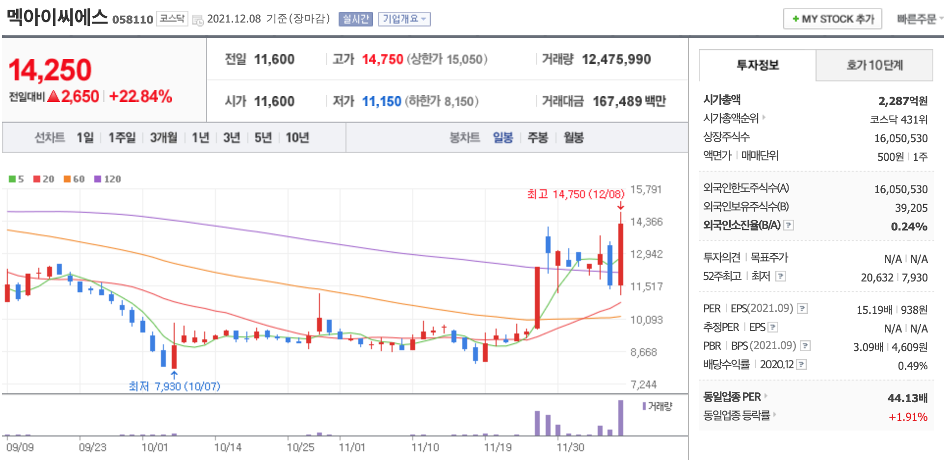 멕아이씨에스 주가가 폭등세를 보이고 있다. 이날 코로나19 감염 환자가 역대 최다를 기록했다.