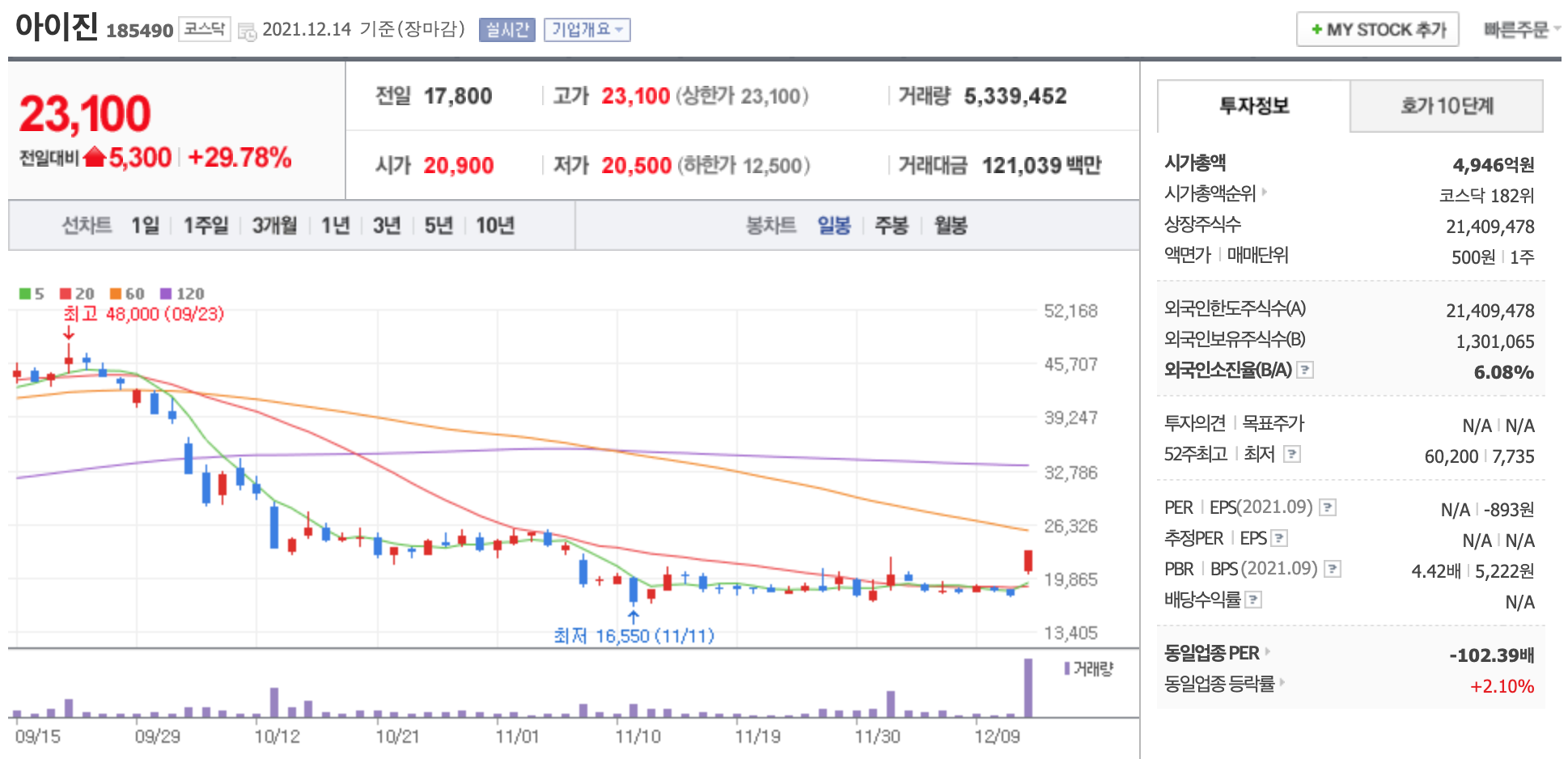 바이오 벤처기업 아이진 주가가 신종 코로나바이러스 감염증(코로나19) 새 변이 오미크론 백신 개발 착수 소식에 장 초반 상한가를 찍었다.