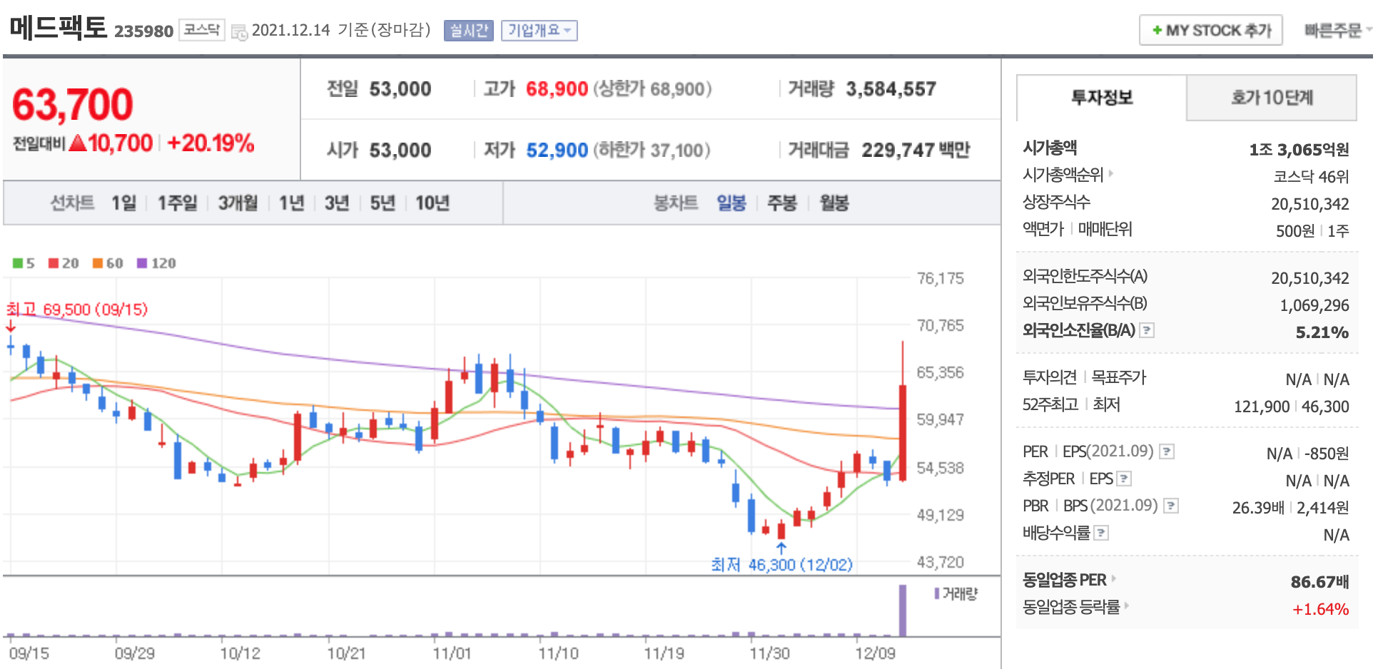 메드팩토 - 2013년 6월 설립되었으며 전문의약품, 항암제, 면역항암제 등을 개발하고 있음.