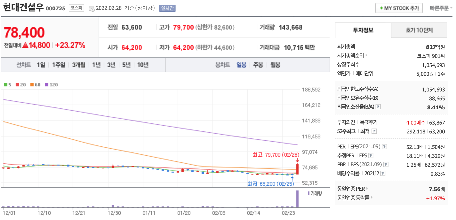 현대건설우, 도시정비사업 1조원 수주 소식에 급등