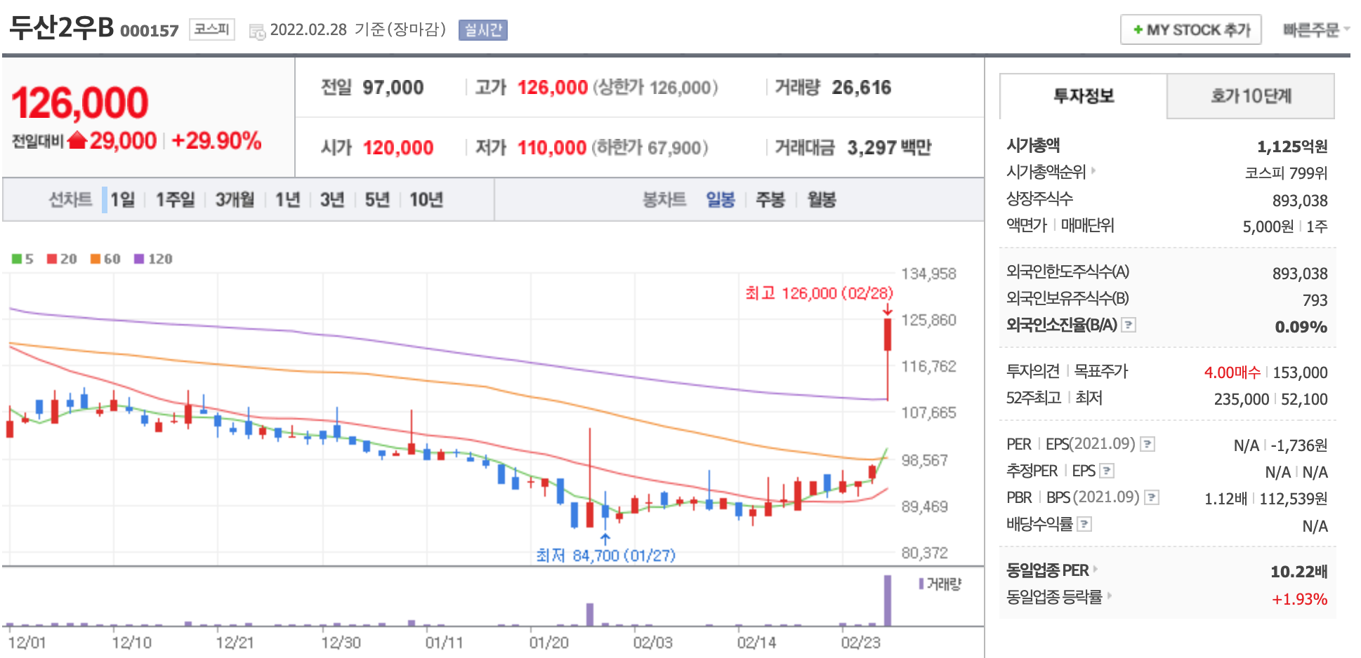 우선주 두산2우B(29.90%)는 상한가를 찍었다.