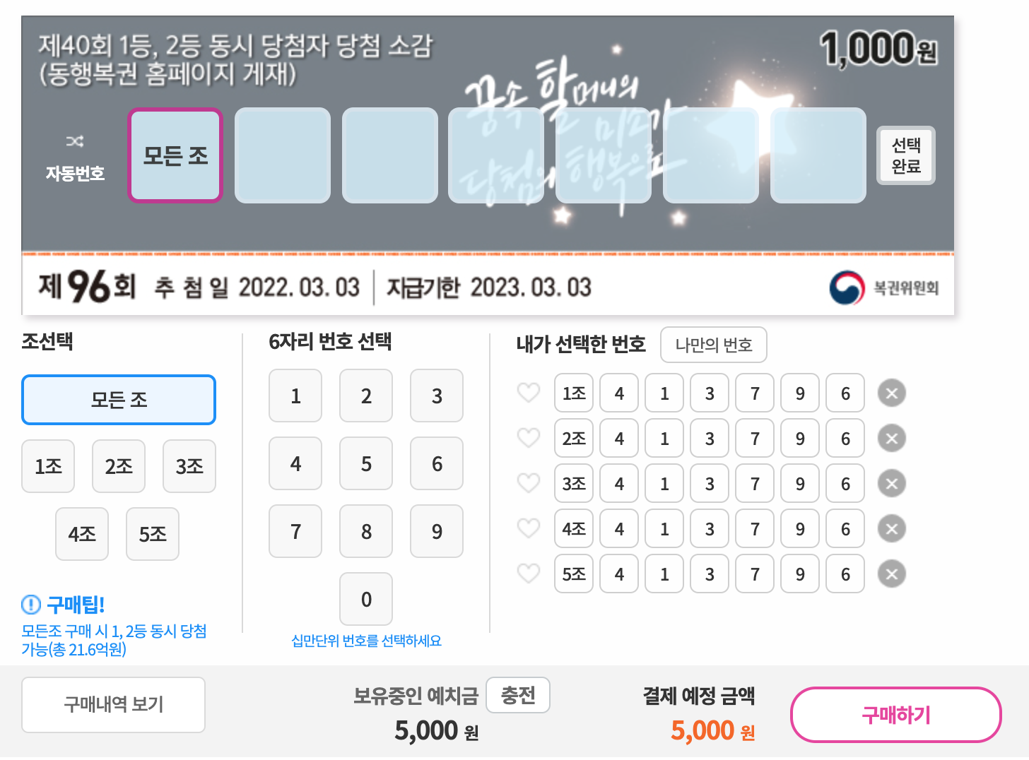 1조만 하고 싶으시면 1조에 다른 번호를 여러 가지 방법으로 취향에 맞게 하시면 될 것 같습니다.