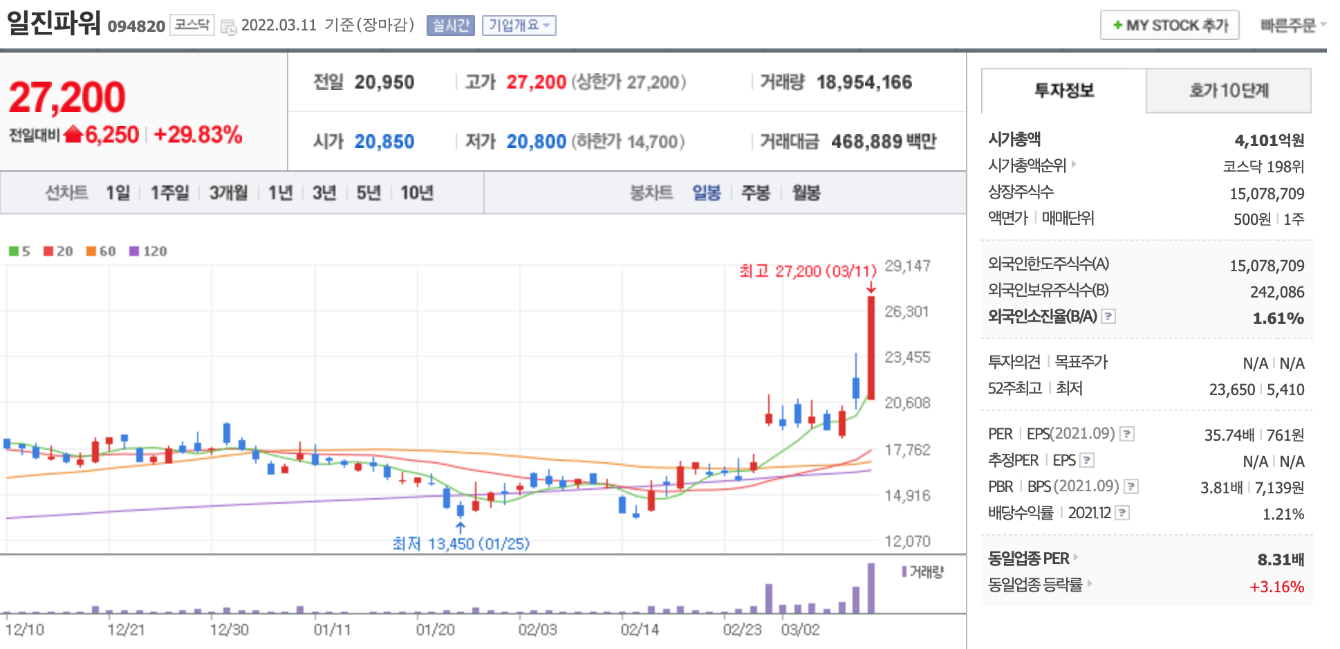 이날 일진파워 주가가 급등한 배경은 윤 당선인이 현 정부의 탈원전 정책을 폐기할 것으로 전망되자 이에 따른 수혜를 입을 것이란 기대감이 반영되면서다.